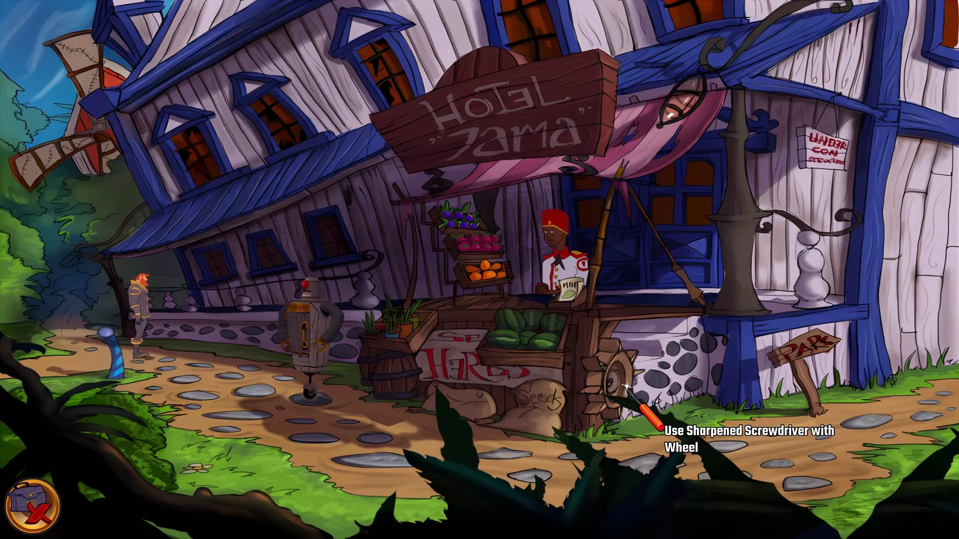 和店员交谈以获取失事飞船的信息,但他什么都不知道,反而让你去公园询问老人。询问宣传册的事,他愿意用一些草药来交换,并给了你一张他要找的东西的图片。询问轮子的事,他很乐意把轮子给你,但轮子被螺栓固定在支架上。用磨尖的螺丝刀拧下轮子并拿走它。