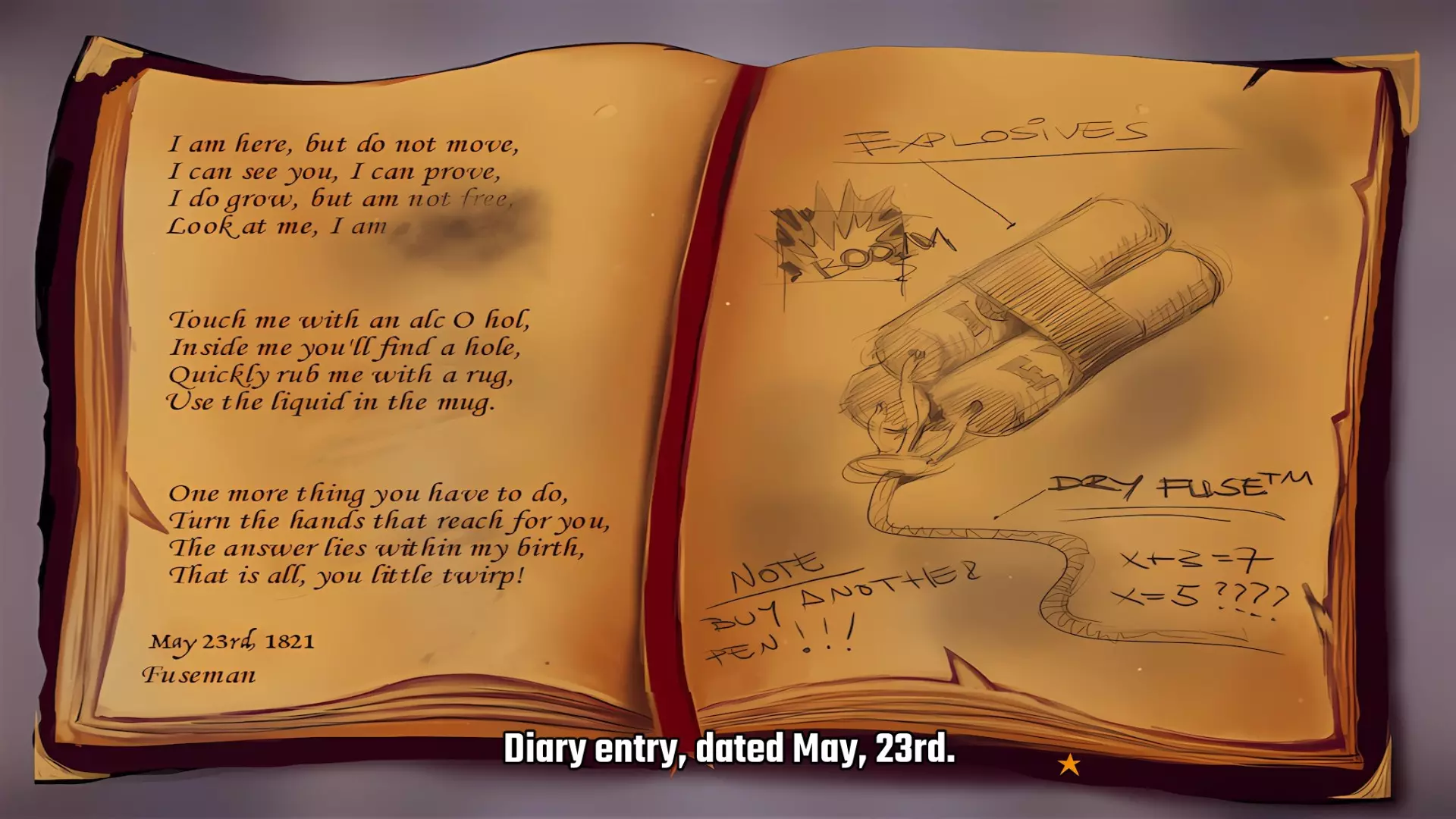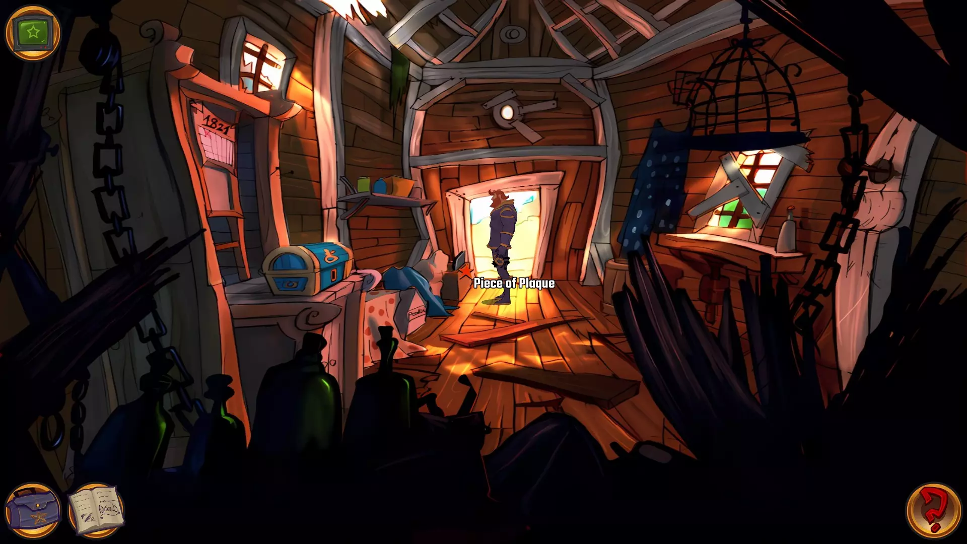 拿起锤子 检查箱子,它是锁着的。 查看日历,上面标记着1821年5月1日 拿起窗户清洁剂 检查床单,布拉维船长会揭开它,拿起牌匾碎片和日记。