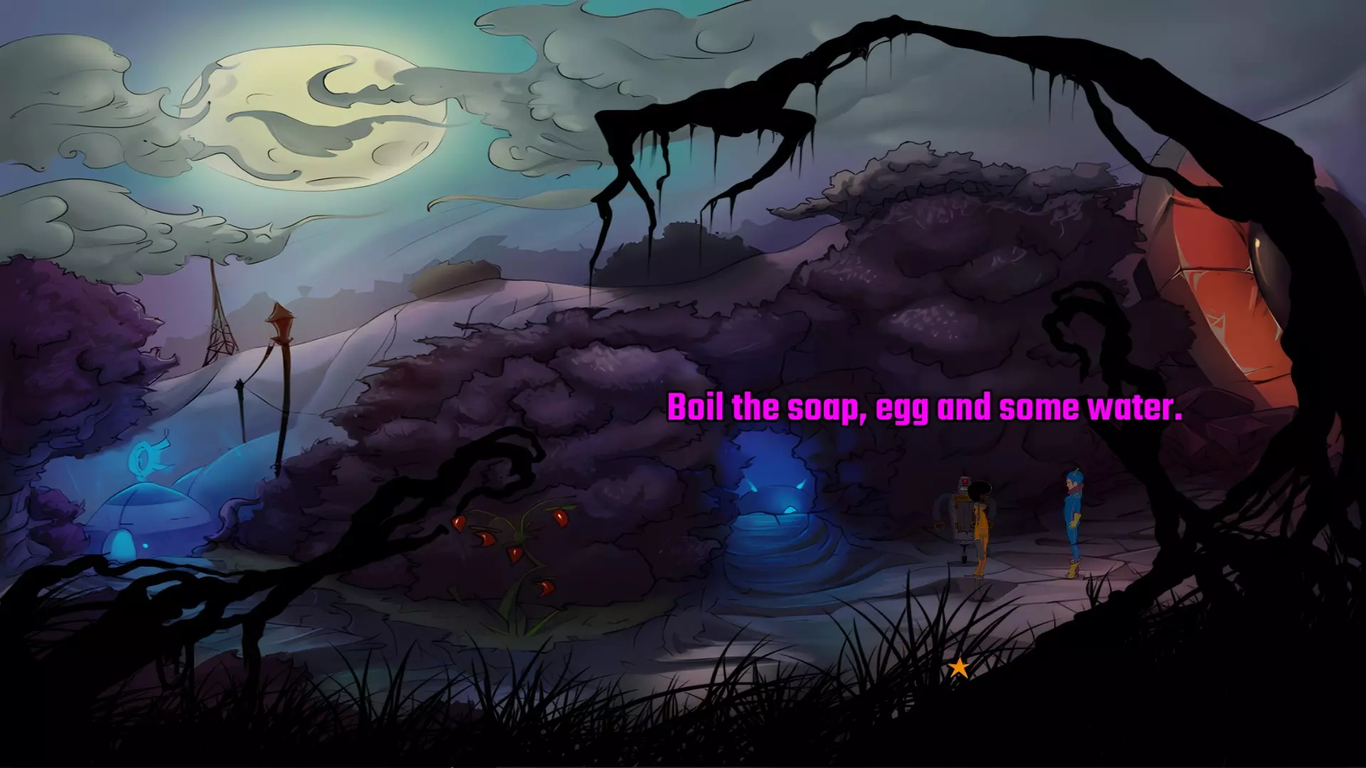 一路返回到你最初着陆的地方,也就是露娜所在的位置。向她询问缓解宿醉的方法,她会告诉你要将肥皂、鸡蛋和水混合并煮沸。