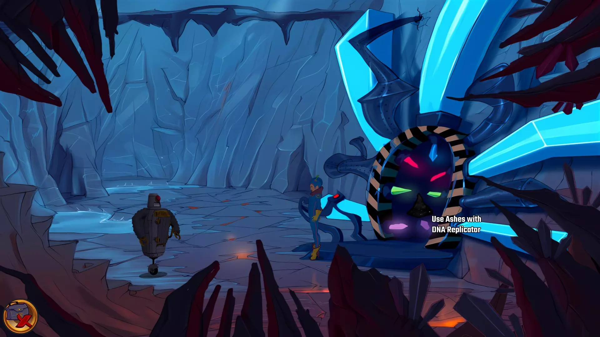 向右走返回DNA复制器。 现在电力已恢复,尝试按下红色按钮,但其中一块紫色水晶已损坏。带上这块失效的水晶。