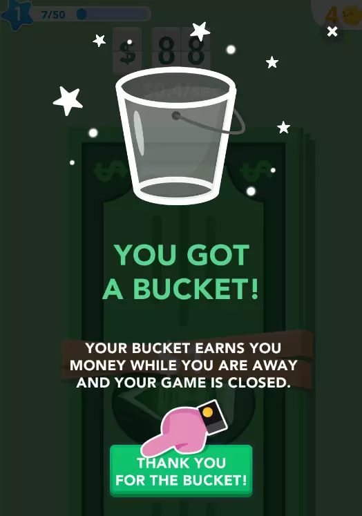 你会获得奖励以及这个桶,你可以升级它来容纳更多的钱。当你看到桶出现在屏幕左侧时,只需点击它,然后选择【收集】来收取金钱,或者选择【升级桶】以让它收集更多的钱。