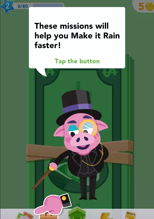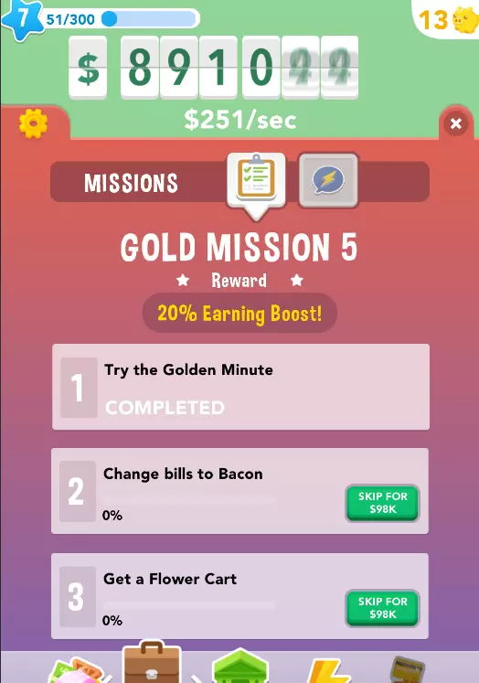 任务是屏幕左下角的棕色手提箱。持续完成任务可以提高每秒赚钱速度,然后领取奖励。