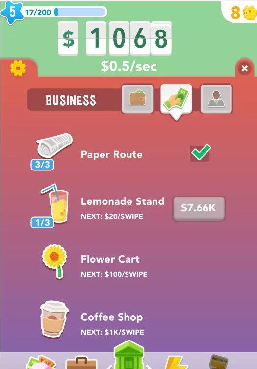 3) 升级成就。只需按照步骤2的方式购买升级。注意大多数升级有3个等级,要购买【所有升级】。钞票成就对应的是你屏幕上的主要货币,你会看到它从2美元钞票开始,然后逐渐增加到200美元等等。