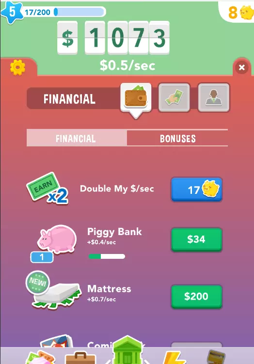 左上角的蓝色星星代表你的等级,等级越高,获得的增益效果越多。右上角是金币数量。屏幕底部是可购买的物品,能帮助你更快地获取金钱。