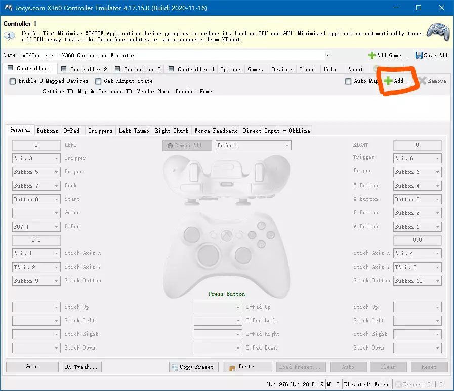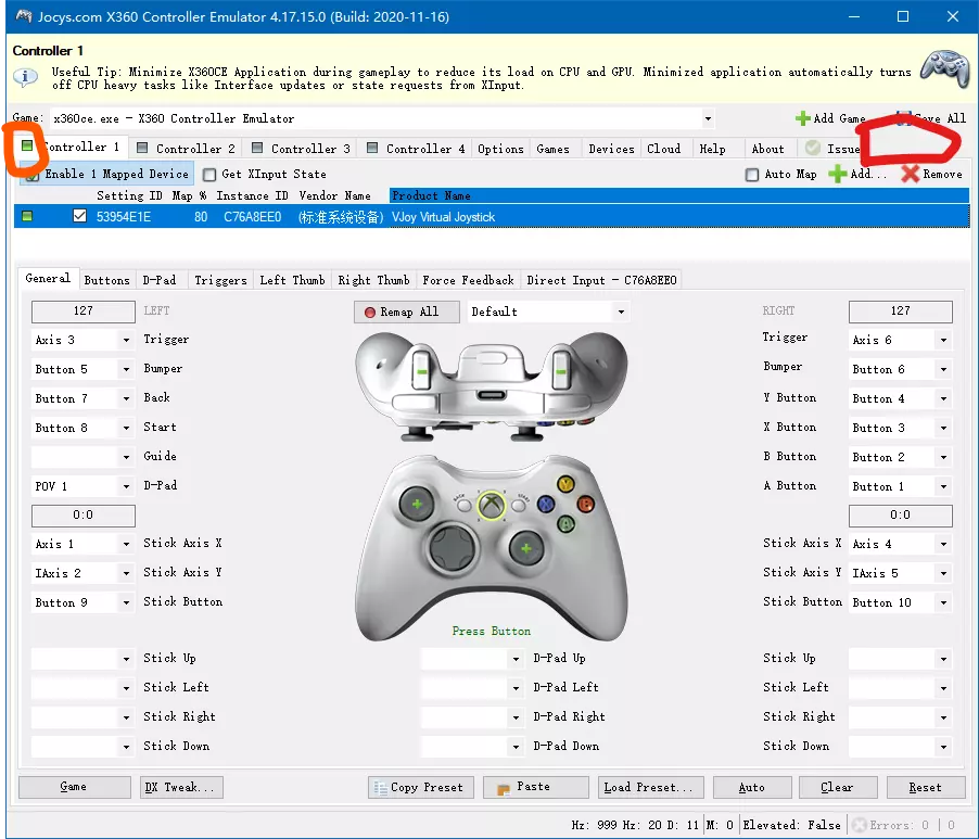 2. 主要只修改圈起来的这几个,修改完成后记得勾选左上角的【Enabled】 x360ce 1. 打开x360ce之后应该是这个界面