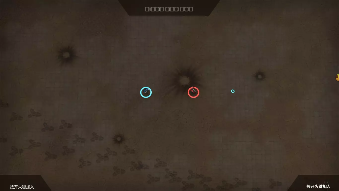 之后就可以直接打开游戏愉快玩耍了。 实际游玩: 《血腥大地》本地联机需要进入游玩界面后按开火键加入,也就是按【Button 1】设置的【1】键即可。 加入后就像图片中显示的那样,蓝色是键盘玩家,用WSAD移动;红色是手柄玩家,用Vjoy里设置的↑↓←→方向键移动。