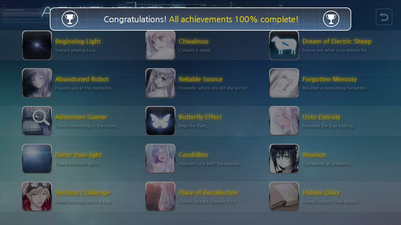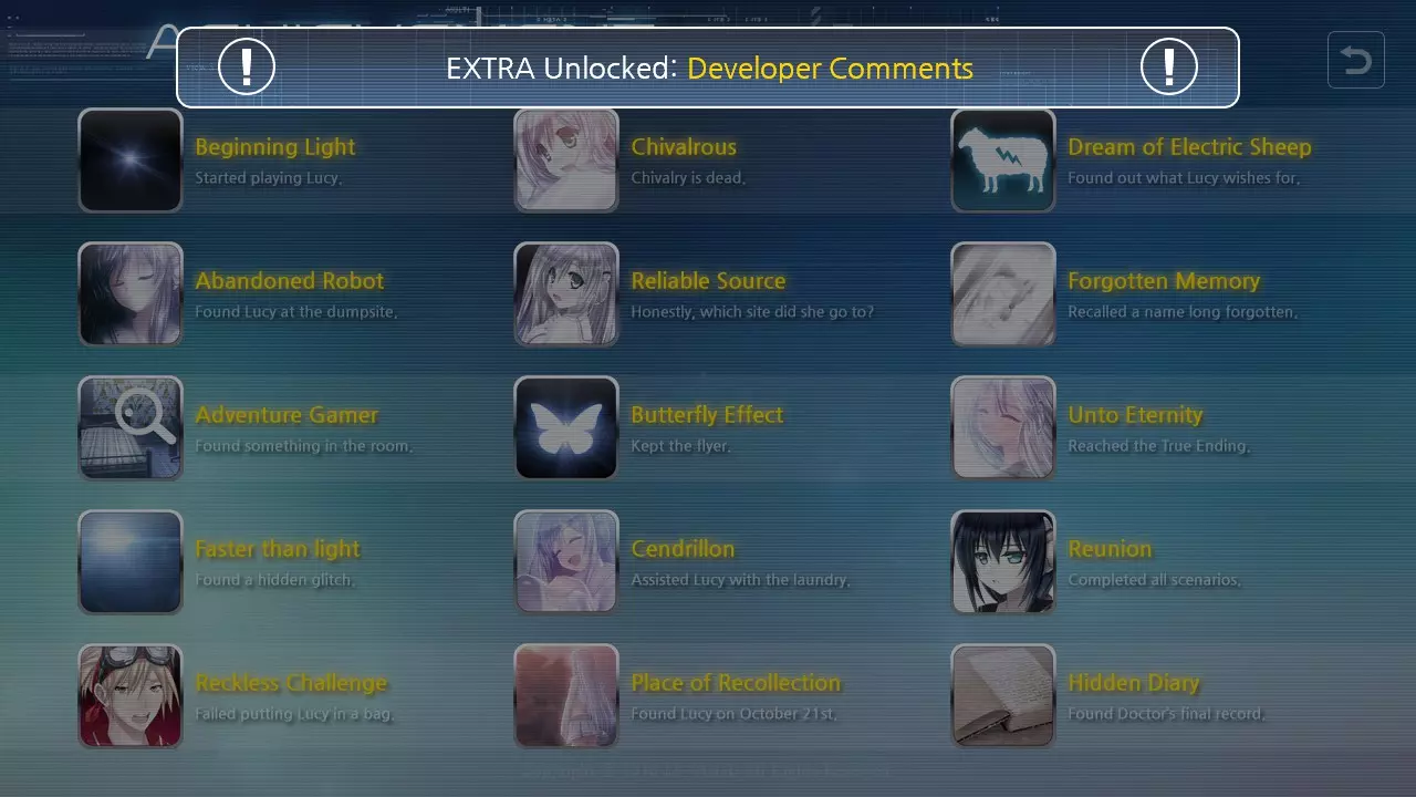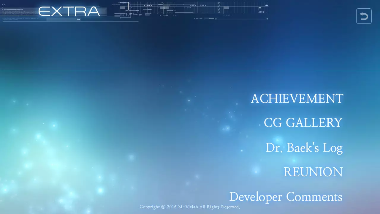 点击灯光,屏幕会出现故障,游戏将进入恢复模式并要求输入密码;密码为【INCORRECT】。这将解锁成就【Faster Than Light】。 在【EXTRA】菜单中,观看并跟随【Reunion】,当出现提示时,点击【From the Beginning】。这将解锁成就【Reunion】,并解锁新选项【Dr. Baek’s Log】。