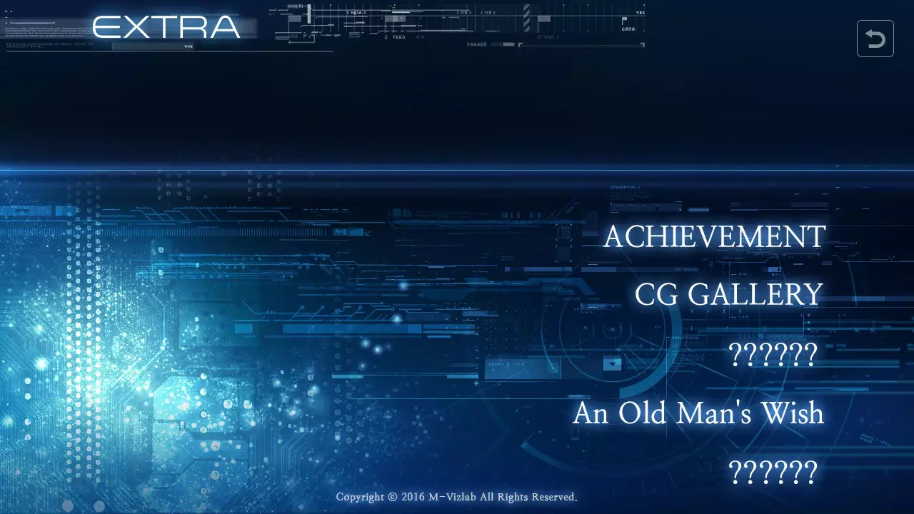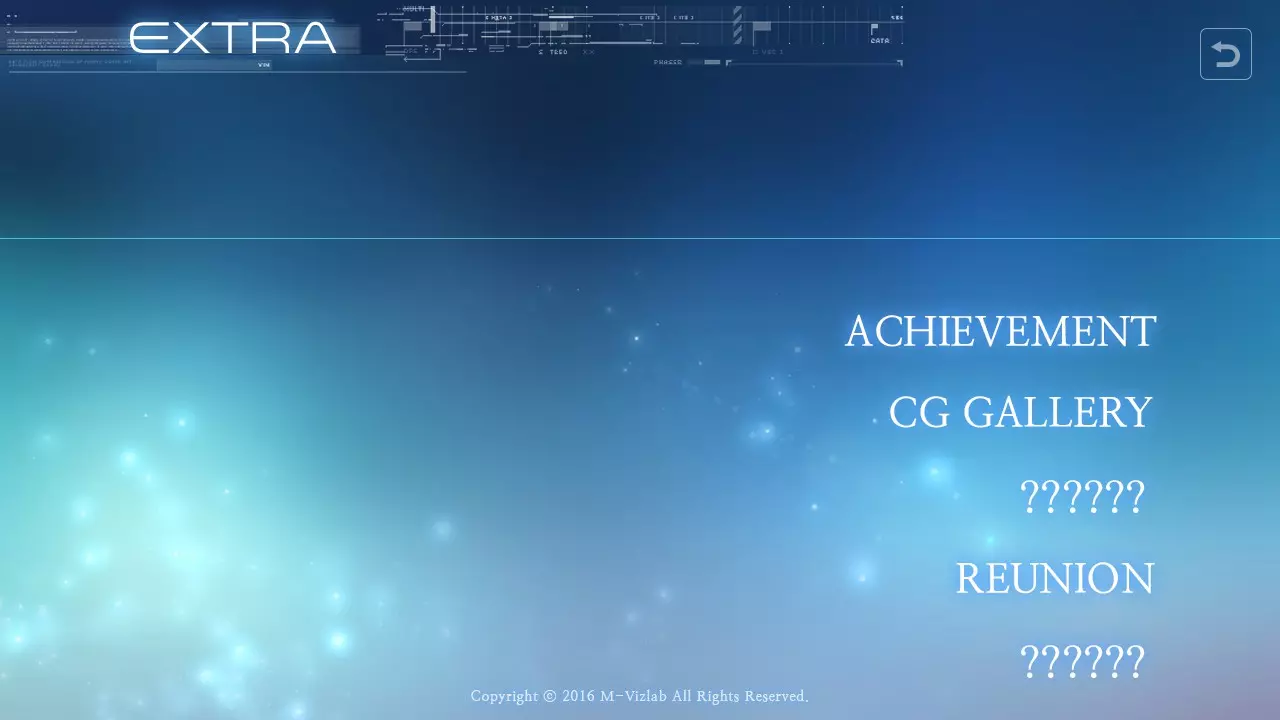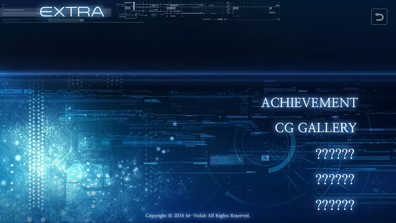 额外菜单 在额外菜单中,你将看到五个额外板块,分别是成就、CG画廊以及三个未知内容。