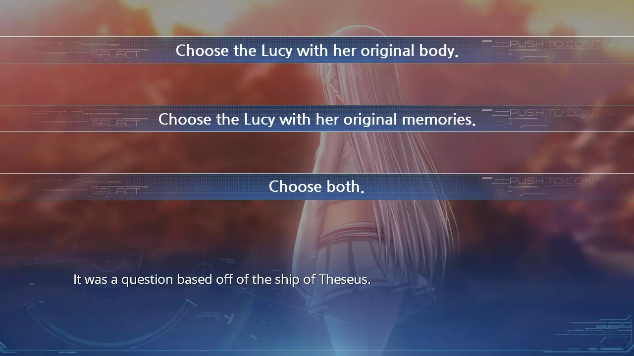 选择“去找她”和“继续寻找”这两个选项,将解锁成就Place of Recollection。 选项014 - 选择拥有原本身体的露西。 - 选择拥有原本记忆的露西。 - 两个都选。