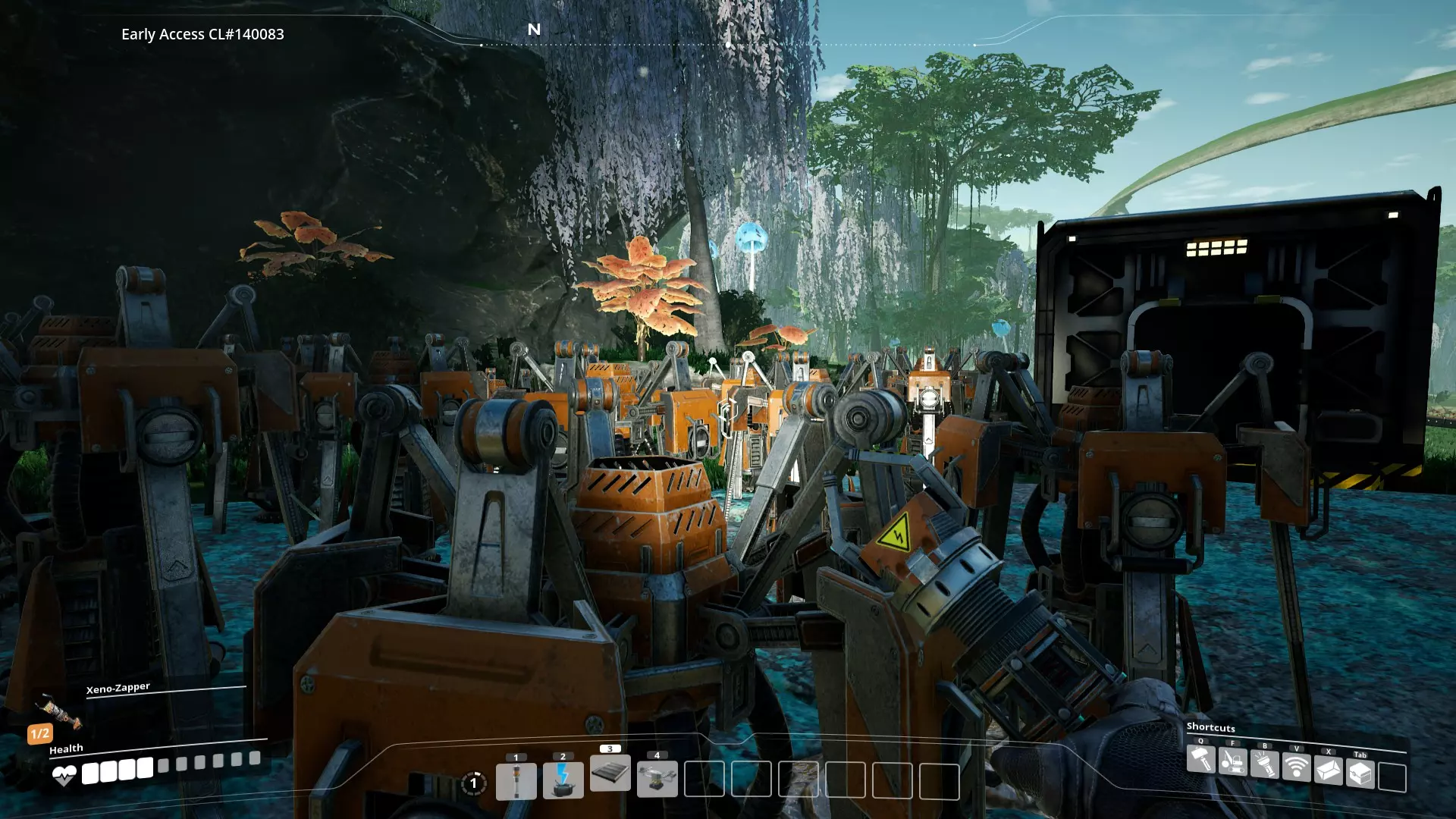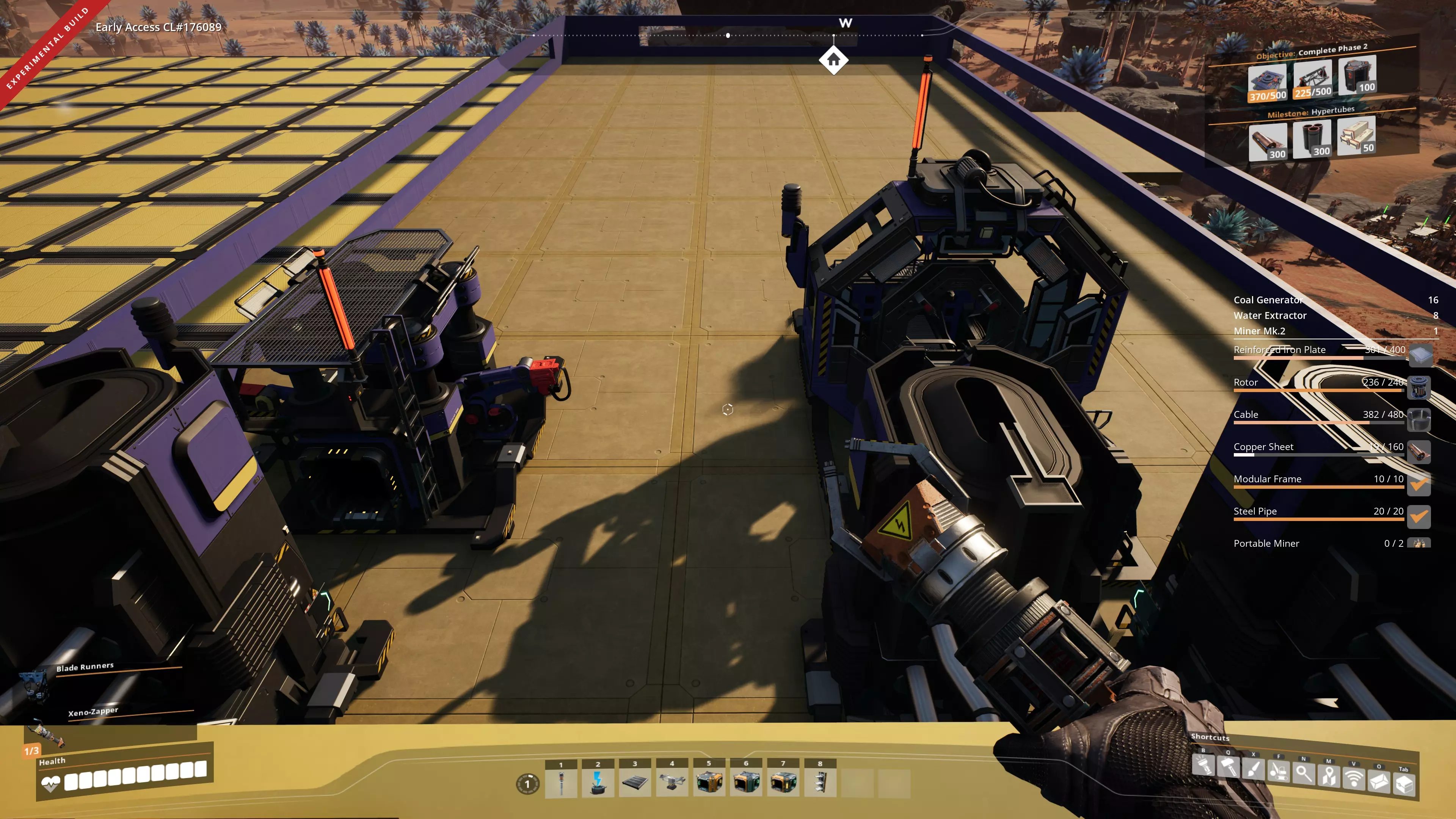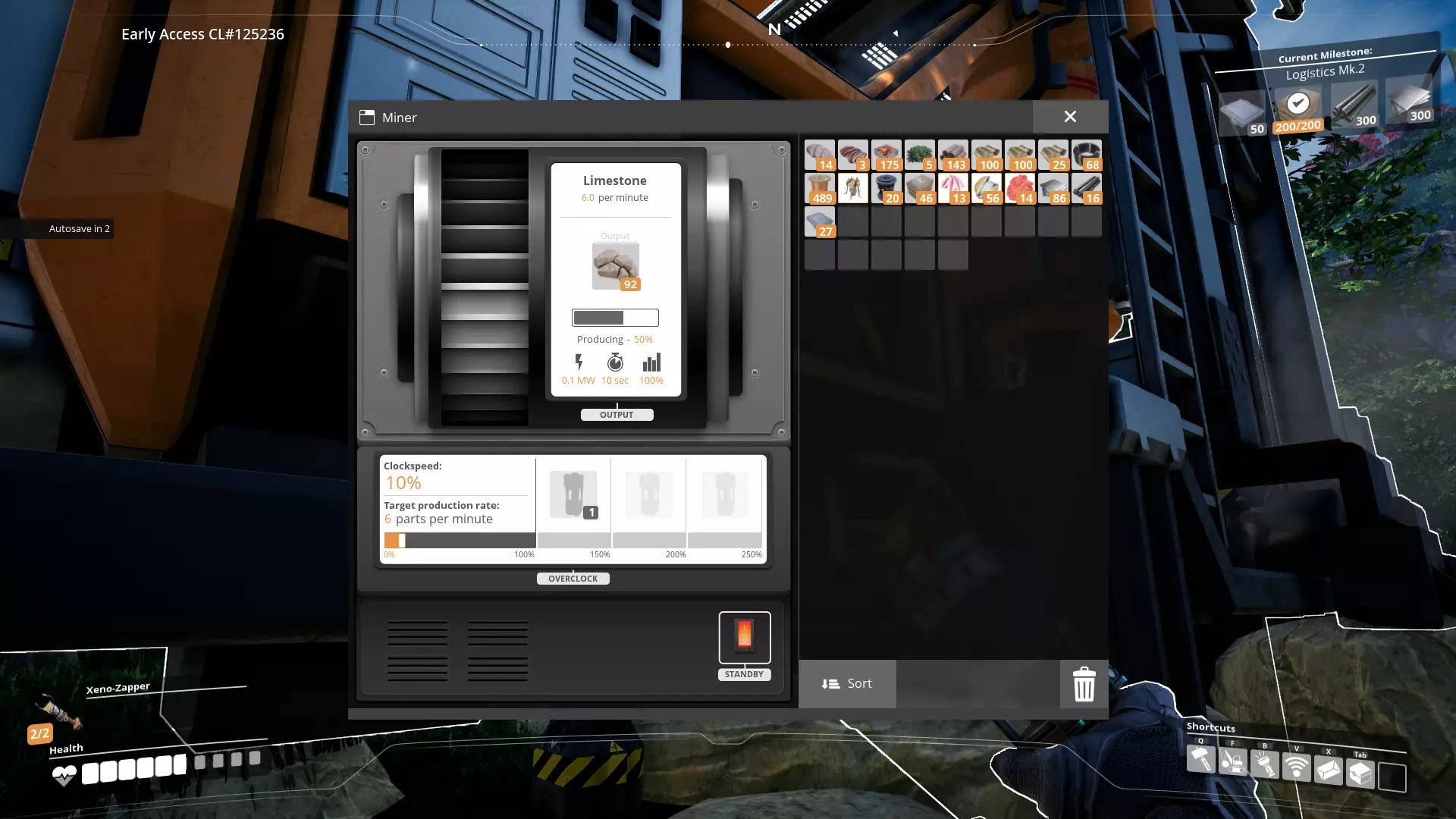 在单个资源节点上,你可以相对轻松地放置大约60个便携式采矿机。它们的效率各约为采矿机Mk1的四分之一,但拥有100%的库存容量。天啊,这库存,我要怎么把60个采矿机带过去呢——我来告诉你,你只需带上两堆铁棒和三堆铁板就行。你要做的第一件事是……