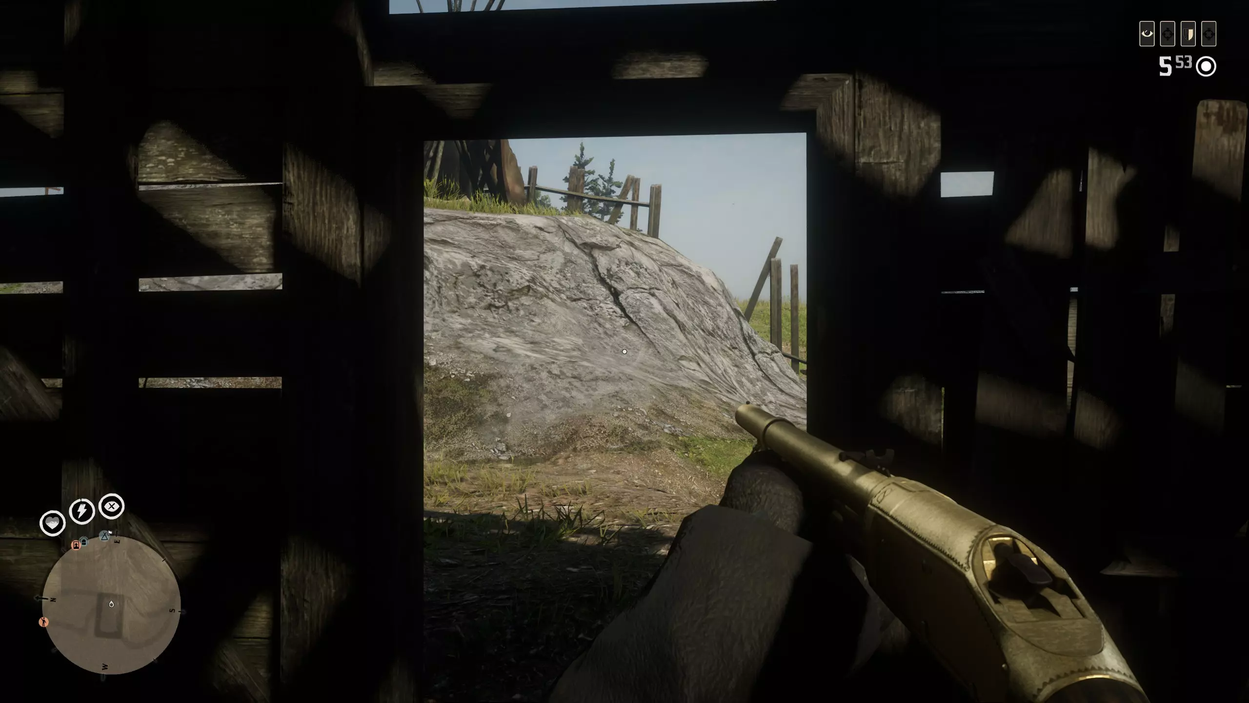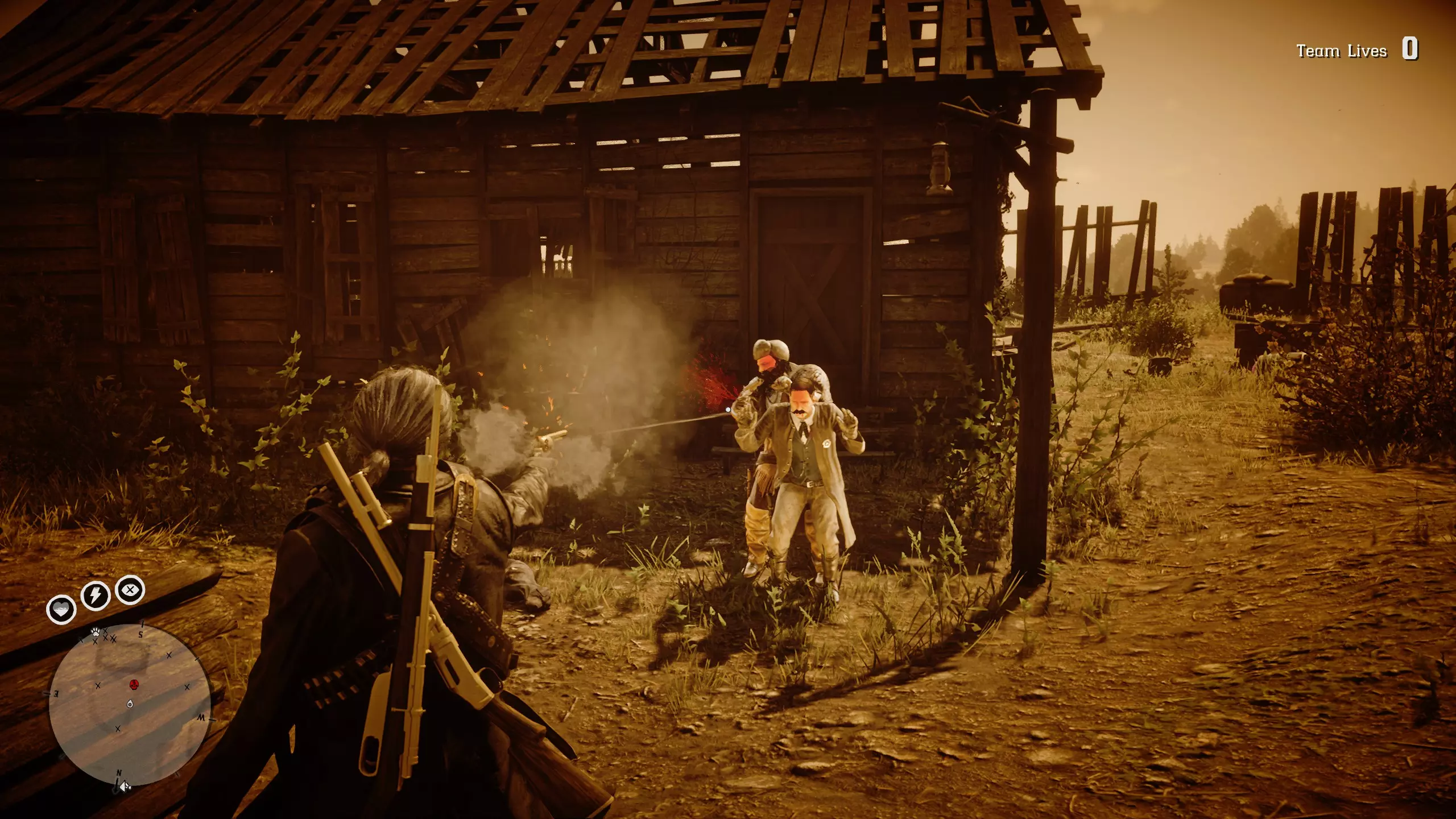 在这个任务中总共有3波敌人。你已经清理了1波。在你把尼克绑起来后,第2波很快就会到达。我喜欢把他放在小屋里,这样在交火时,我就不会像有时右键瞄准马匹进行互动那样不小心瞄准到他,这非常烦人。 所以你必须动作快点,以免被那些人伏击。 不管怎样,躲进小屋里,这里将是你防御最后2波偷猎者的据点。进入第一人称模式,因为在狭小空间里用这种模式射击更容易。你可以在小屋内使用霰弹枪和狙击步枪。这是一个完美的防御地点。它有2个门口,门是可以关上的。当门关上时,敌人通常不会攻击你,甚至不会进来。所以尝试每次只打开一扇门。你可以透过窗户和棚屋上的破洞射击,敌人通常不会这么做,或者会严重射偏。继续清理敌人。如果战斗太困难,你可以射击笼子上的锁放出熊。它们会帮你杀死敌人,之后要么跑掉要么在战斗中死亡。熊不会进入棚屋,所以你在里面是安全的,甚至可以在棚屋里杀死熊。熊会窃取你与职业无关的战斗经验值。