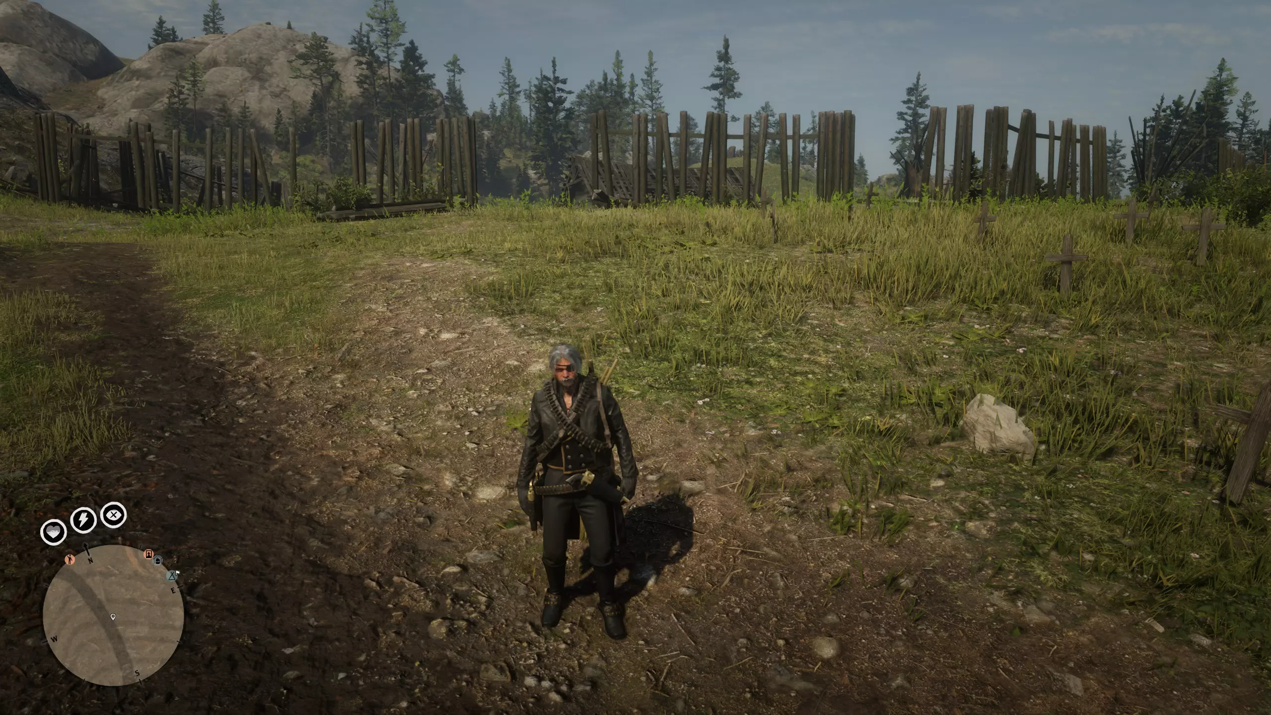 我站着的这张图大致展示了你需要跑到多远再折返,并尽快跑进小木屋。不要浪费时间,一旦你到达红色边界,敌人就会带着自瞄和数量优势向你袭来。这在最高难度下尤其致命。但这个悬赏任务仍然是最容易且最值得玩的。 敌人不会立即出现,这可能会让你误以为自己跑得不够远,但我建议你还是先跑出去再跑回木屋。久而久之,你就会知道在返回木屋前需要跑多远。所有敌人被消灭并搜刮完毕后,带上尼克前往大平原。顺便说一下,传说任务总是在完全单人的战局中进行,所以动物的刷新情况总是很好。你的目标是确保从任务开始算起总共花费30分钟,以获得最大奖励,然后在黑水镇交付赏金。 交付赏金后有48分钟的冷却时间,所以你完全可以在这48分钟内暂时不去升级赏金猎人职业,去做些别的事情。因为普通的三星赏金任务给的经验值很少,不值得为了拿满奖励而等待30分钟。更重要的是,大多数普通悬赏任务在你接近目标时就开始倒计时,通常持续15到18分钟,有时甚至更短,比如7分钟,所以你无法获得完整30分钟的额外奖励。 当你多次完成这个悬赏任务后,你会发现它非常简单。完成它会成为你的肌肉记忆,不再具有挑战性。 很棒的游戏 【荒野大镖客Online】本身是一款很棒的游戏。如果你喜欢获胜(可能在玩家对战中)或刷任务,比如为商贩补货、为私酒贩酿造并销售不同的私酒,如果你喜欢收集物品、完成各种每日挑战、与马匹互动,或者喜欢展示自己作为赏金猎人的能力,甚至喜欢作为博物学家追踪动物。随着时间的推移,你可能会积累大量财富,尽管偶尔会遇到作弊者和连接问题,但这确实是一段非常棒的体验。希望你玩得开心,一切顺利!