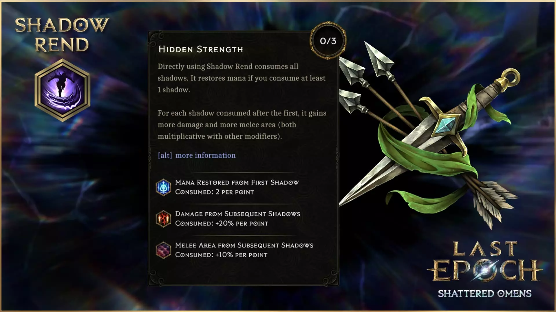 通过精心的走位,你的影子在消失前可以被多次重复利用。 隐藏之力 隐藏之力是暗影屠戮的替代选择,适合更倾向于强化暗影撕裂本身的玩家。此节点会消耗所有影子来恢复法力,并为暗影撕裂提供更高的伤害和更大的近战范围,具体能释放出多么强大的大范围攻击,取决于你生成的影子数量。