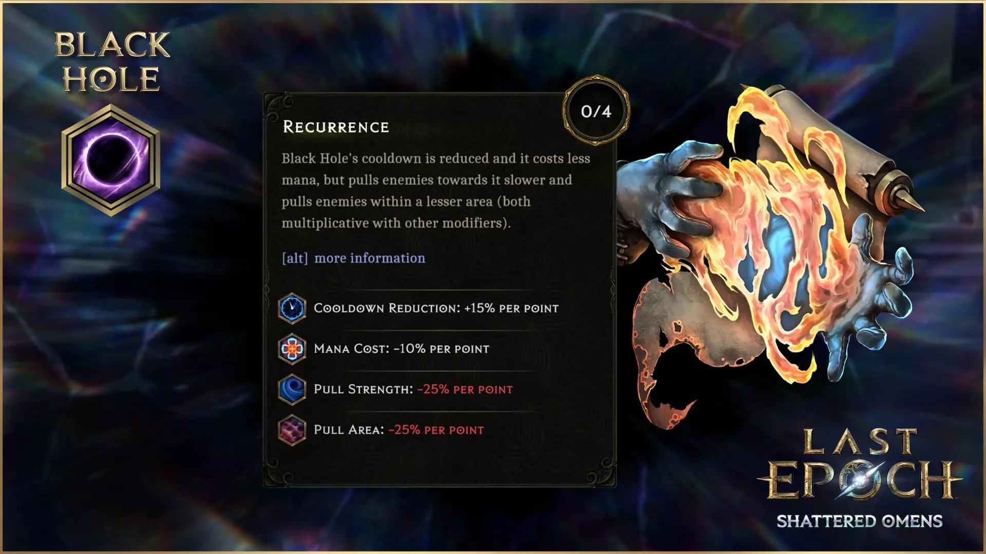 黑洞 黑洞现在可以获得比以往更高的冷却时间减少效果,并且可以获得额外充能。 我们对【循环】进行了调整,现在它可提供最高60%的冷却时间减少(原为冷却恢复速度提升),新节点【口袋维度】则会增加一次充能。
