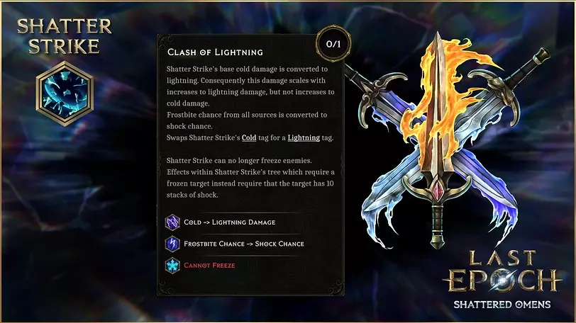 我们还在技能树中明确了魔力相关行为,具体说明它们是影响恢复魔力的魔力球,还是提供即时魔力恢复。例如,【能量转化】现在将魔力球中25%的魔力转化为两倍的守护值。 【碎裂打击】 【碎裂打击】是另一项在第四赛季获得节点更新的技能。 【冰冻碎片】现在直接释放时发射8枚冰刺,间接释放时发射数量减半。冰刺本身现在拥有300%的附加伤害效率和60点基础伤害。它们不再每3点附加近战伤害获得+1点法术伤害。