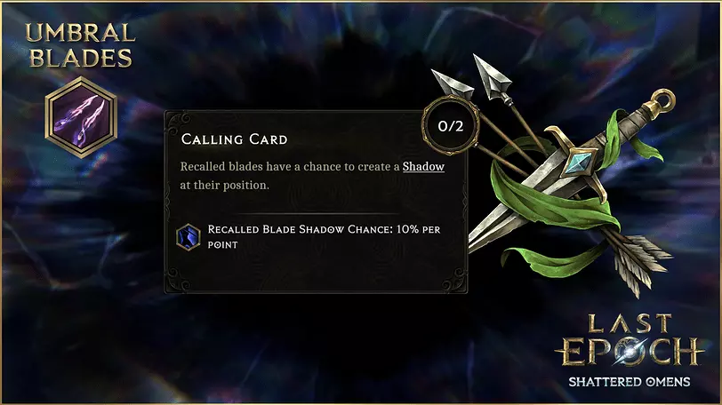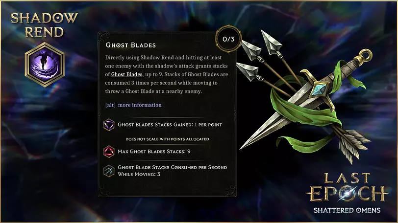 在被动技能树中,你可以提升伤害和范围加成、降低魔力消耗、获取转化节点、改变技能移动方式等等。以下是你将在【暗影撕裂】技能上看到的部分节点: 【幽灵之刃】 此节点能让你获得幽灵之刃层数。当这些层数被消耗时,会向附近敌人投掷幽灵之刃。幽灵之刃是一种投掷攻击,有100%几率造成暗影匕首效果。