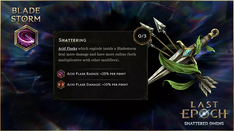 碎裂 碎裂是为酸性烧瓶爱好者准备的节点。装备此节点后,在剑刃风暴中爆炸的酸性烧瓶将拥有更大的半径。对于希望控制或掌握更广泛攻击范围的玩家来说,这是一份不错的馈赠。