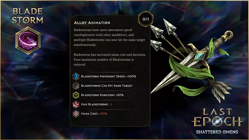 合金动能 合金动能显著增强你的剑刃风暴自主搜寻并摧毁敌人的能力,使其获得更高的移动速度,并且每个剑刃风暴能够同时击中同一个目标(也称为【霰弹效果】)。