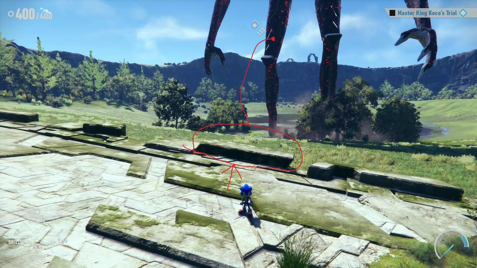 前往泰坦: 难度不算大,只是过程单调且耗时很长。如果在这里受到攻击,就重置流程。 第一阶段: 这场战斗是整个流程的难点。目标是击败【飞天龙】时至少剩余100个环。完美格挡会很困难,但我会尽力提供帮助。当你追逐【飞天龙】时,保持静止。导弹会自动锁定你,在它们即将击中你时进行格挡,这样导弹就会击中【飞天龙】。我在格挡导弹方面没什么困难。当你追上【飞天龙】时,必须格挡它的爪子才能对其发起攻击,如果失败,就必须再次格挡导弹。这是整个挑战中最困难的部分,因为它会消耗大量环,但这也是我们要以360个环击败【巨像龙】的原因,以便为这场战斗争取尽可能多的容错空间。我采用的最有效的策略是,当爪子在挥击过程中看起来最大时进行格挡,这是我能最稳定格挡它们的方法。一旦你可以攻击飞兽,就用你拥有的第二个快速环击来牵制它,然后使用跺脚连击,这样应该能结束第一阶段。 第二阶段: 这是战斗中最难的部分,因为现在需要格挡3次才能攻击到 boss,而之前只需要2次。现在 boss 需要从爪子格挡2次后才会进入可攻击状态。但当你成功格挡后,就使用跺脚连击,如果 boss 再次攻击,尝试格挡以使用三角+圆圈攻击,但如果做不到也没关系。 当你进入快速反应事件时,你就成功了!如果你有超过100个环,骑士形态就会非常顺利。 骑士形态