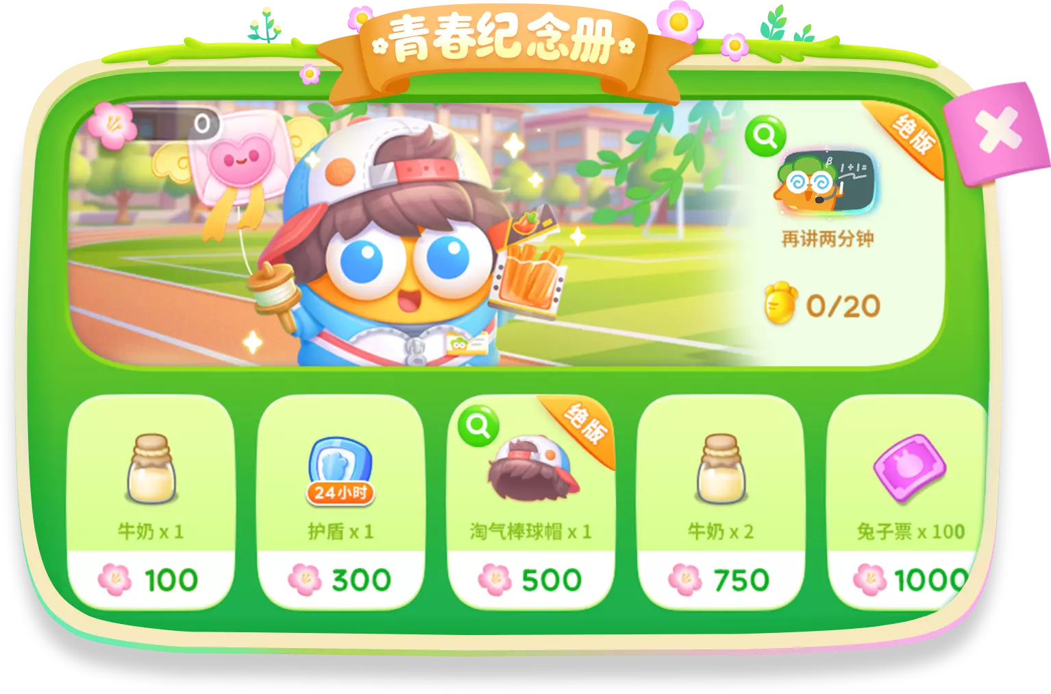 获得足够的活动积分,可以在「青春纪念册」活动商店领取限定活动装扮。头戴「淘气棒球帽」,遮不住的活力旺盛而肆意;身上的「活力校服」,还留着操场奔跑后的余温;别忘记再拿上一包「校门口辣条」,奖励奖励今天辛苦的自己~~