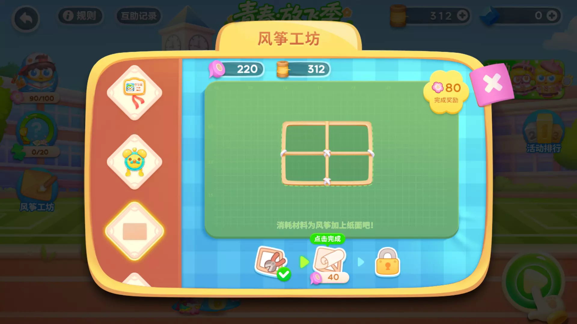在「青春·放飞季」活动中,可以挑战20个固定关卡和1个随机关卡,每天有2次免费挑战机会,免费的挑战次数会在每日24点刷新。挑战活动限定关卡即可获得活动道具风筝制作材料「胶布」和「风筝线」,首次通关和首次获得金萝卜即可获得「胶布」。