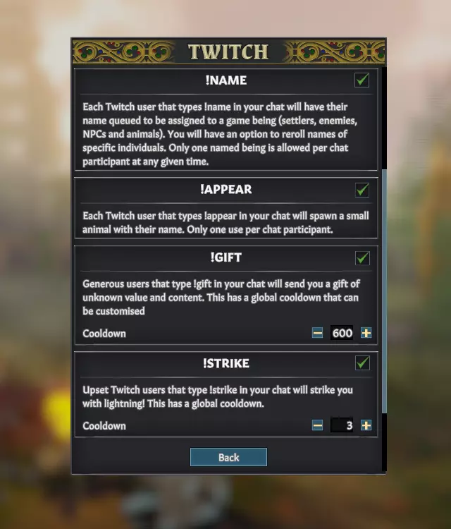 默认设置适用于小型主播,最多支持20人观看。观众数量较多时,建议延长冷却时间。 观众可在聊天中输入的指令: !appear:生成一只随机种类的小型动物,其名称为 Twitch 用户的名字,全局冷却时间约为几分钟。 !gift:由名为 Twitch 用户的【神秘人】在地图边缘掉落物品,礼物价值随聚落总价值增长,全局冷却时间约10分钟。 !name:将你的名字加入名称池,每个生物会从列表中分配一个名字。 !strike:在地图上随机生成一道闪电,全局冷却时间约5分钟。 我们还加入了 Twitch 掉宝功能!《前往中世纪》的Twitch掉落奖励为一个装饰物品,无需研究即可建造,且所需材料较少。