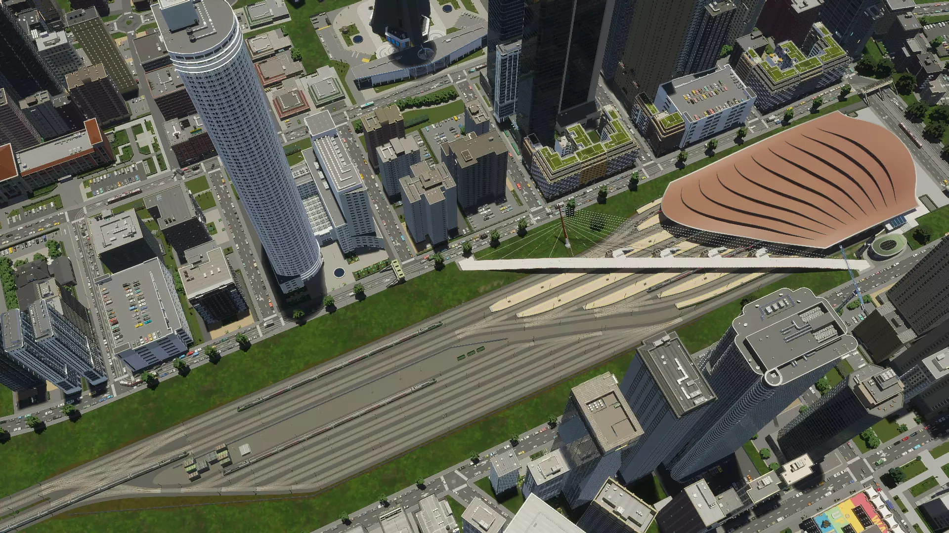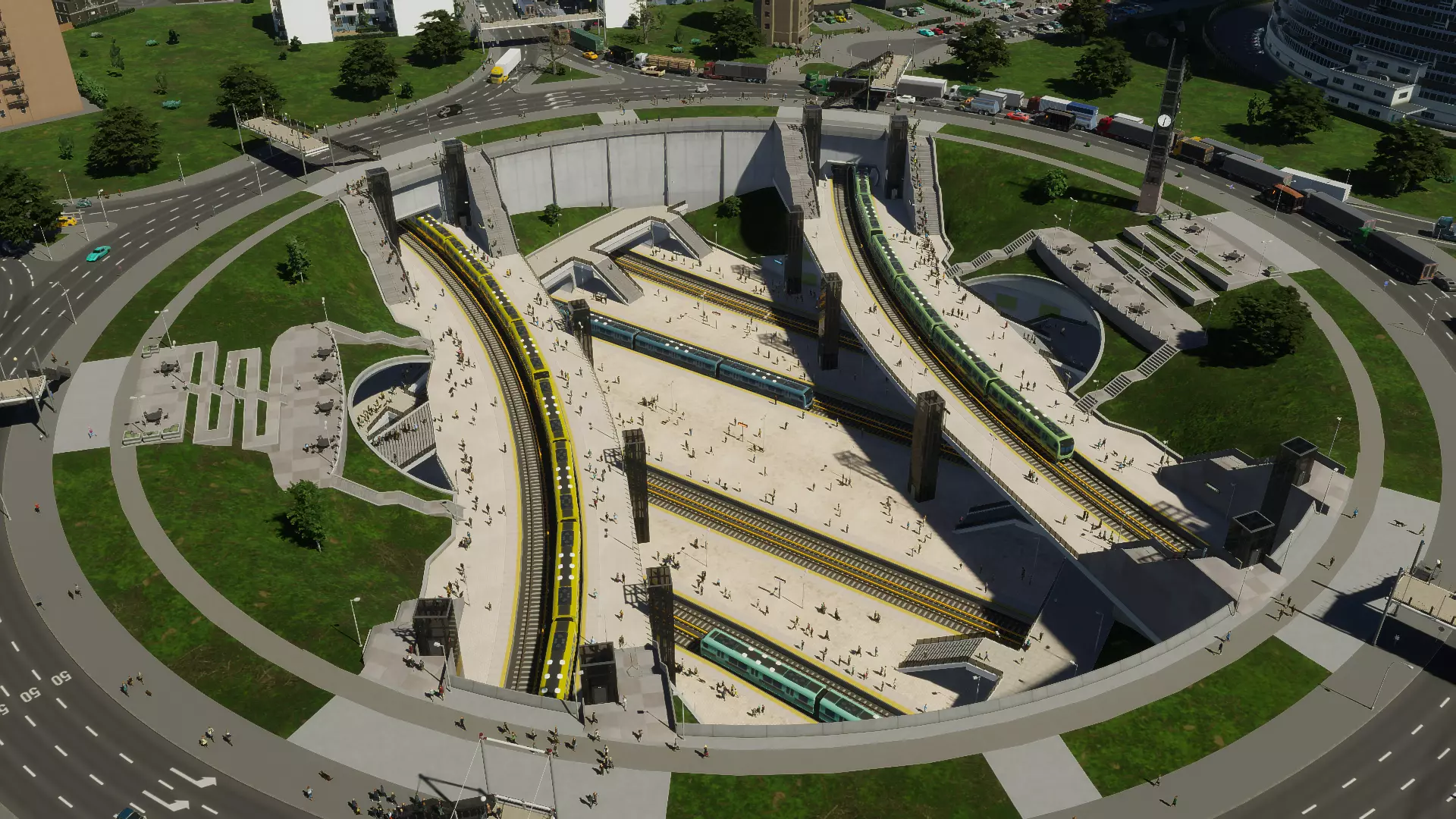 资产编辑器中车站的幕后制作解析。 以上就是全部内容! 希望这能让你深入了解此包中车站背后的设计理念与创作过程。我设计城市车站的目标是为你提供一系列交通枢纽,让它们成为城市中真实的一部分——人们聚集、穿行和停留的地方。 无论是打造大型交通换乘枢纽还是小型社区中心,我都非常期待看到你在自己的城市中如何运用这些车站。 感谢阅读, Bad Peanut 你可以找到更多Bad Peanut为《都市:天际线》(1)和《都市:天际线2》创作的资产! 请欣赏这些最繁忙车站的最后几张截图!