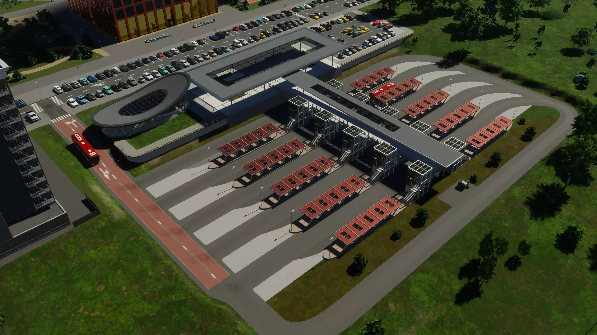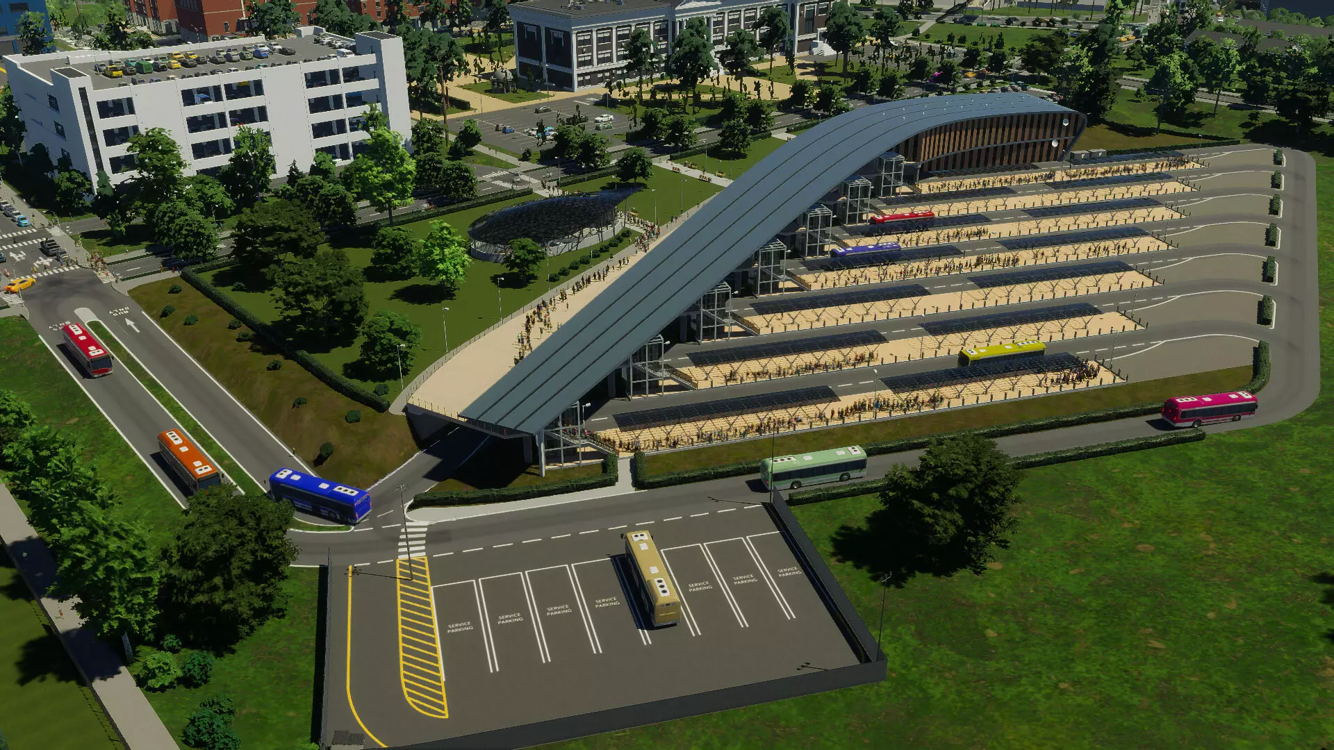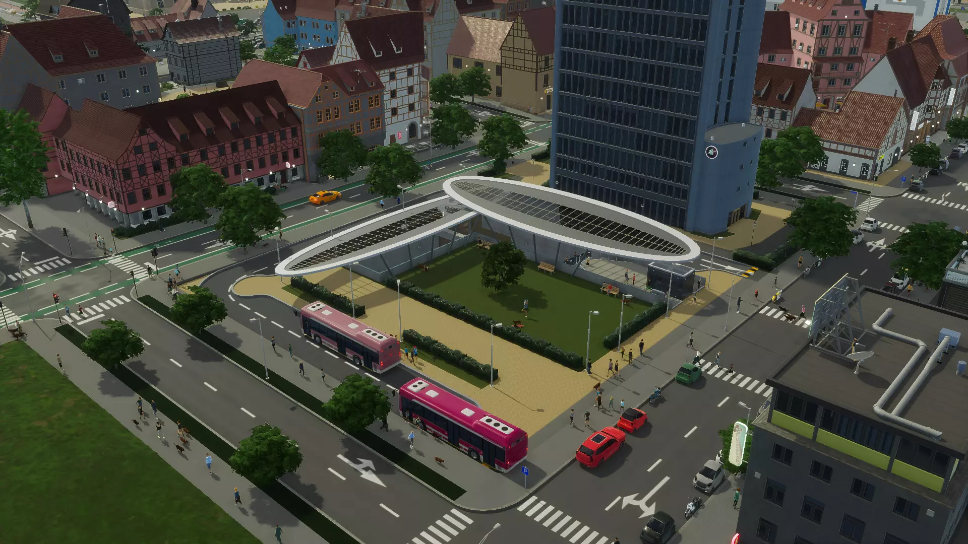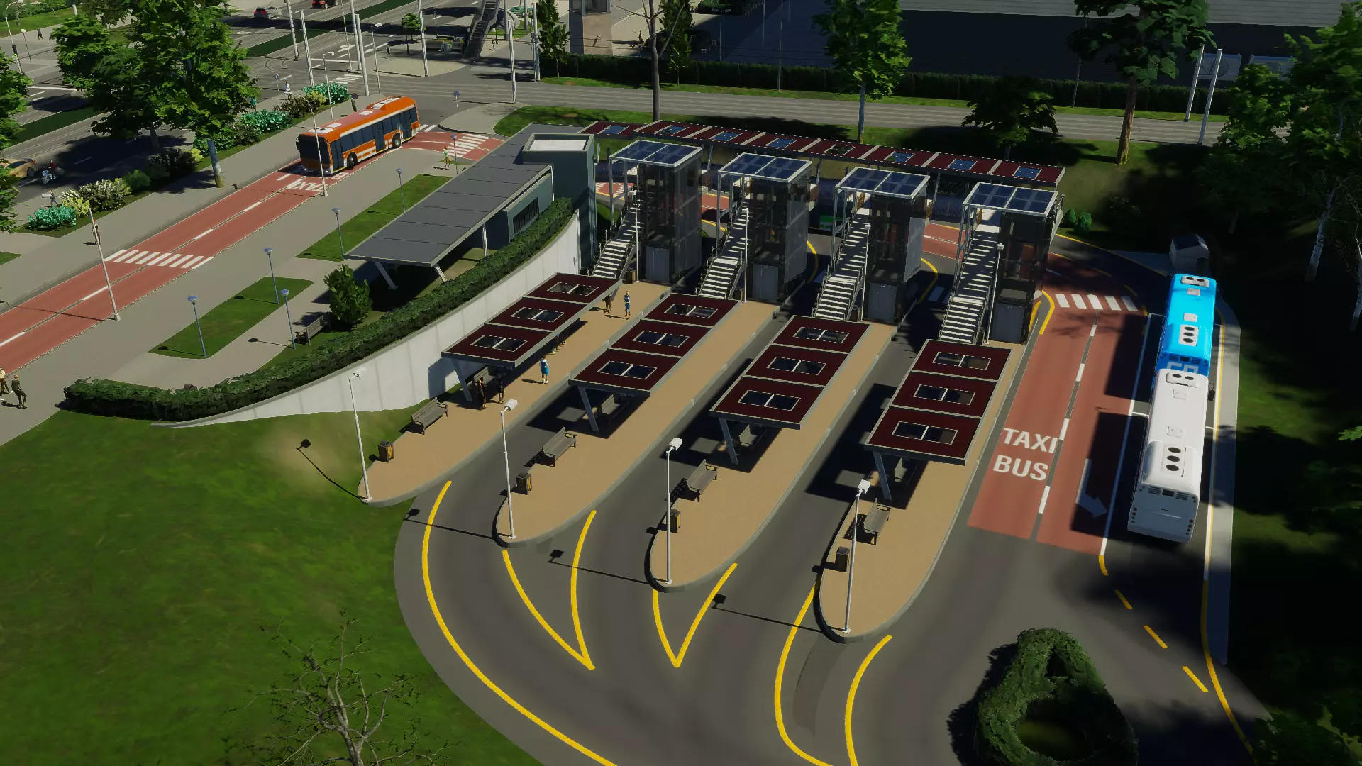 小型城市公交站 大型城市公交站 大型城市公交站的功能与其小型版本类似。它占地面积更大,可容纳更多公交站台。每个站台都设有驶入式停车区,以便其他公交车能够绕过已停靠载客的车辆。 该公交站有两项可用升级——额外站台和地下地铁接口。 站台顶部采用两种交替设计,中央广场和大厅的主屋顶以及地铁接口也同样如此。 市民可以在出发前在此休闲,因为该车站同时也充当周边区域的公园。他们还可以将车站用作小型公共停车场,用于停车换乘或前往附近场所。