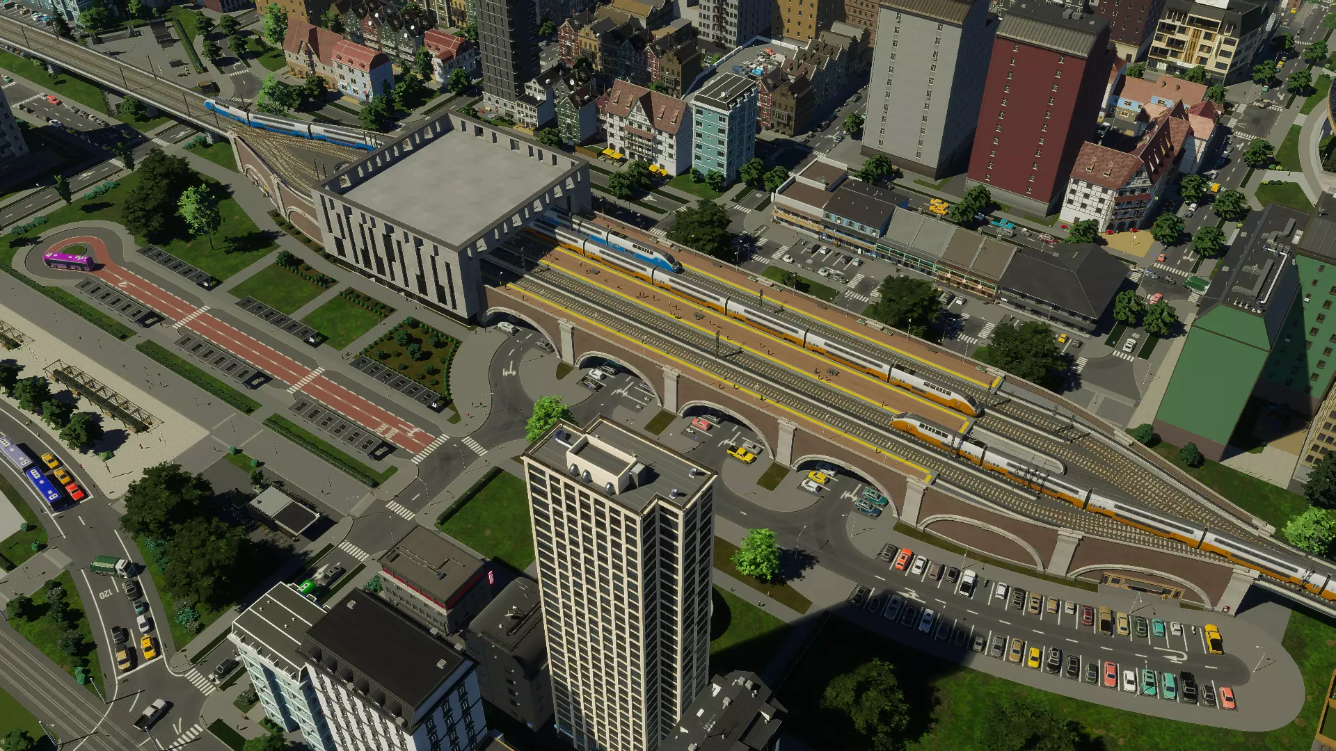 高架绕行火车站 城市中央火车站 这座地标性车站是本组合中最大的车站。在未进行任何升级的基础形态下,它拥有12个不同长度和曲率的站台。主入口处设有大型开放式广场,还有一座悬索步行桥供行人从一侧跨越到另一侧,同时连接大部分站台。 车站包含两条主要的连接轨道走廊,地块后方内置一个可容纳8辆车的铁路调车场,无需额外放置调车场即可扩充列车队伍。 该车站初始为终点站,可通过升级在入口大厅下方增加隧道。它还支持【地铁接口】升级和【植物园】升级,使车站既能充当交通枢纽,又能成为城市的休闲空间。