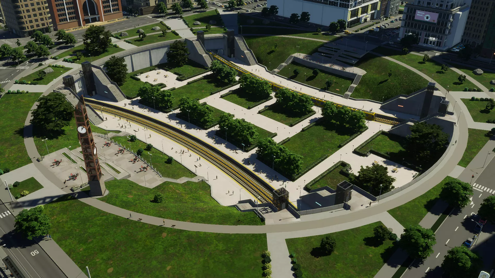 高架绕行地铁站 下沉式地铁公园 这就是地铁站的地标建筑。它宏伟又美观,虽然遵循了我首个资产包中同类建筑的相似设计原则,但却是一次全新的演绎。 作为圆形资产,它可以被放置并优雅地融入周围的公园区域,甚至可以放在大型环岛的中心。如果圆形不是你的首选,它也能适配方形空间,你可以使用路径和地面工具调整内置的连接以满足需求。 该建筑设有标志性的玻璃钟楼,中央公园区域会有市民前来,他们可以在草坪上野餐或做瑜伽,也可以坐在阶梯式露台上观看地铁驶过。第一层轨道采用平滑曲线设计,以配合下沉式公园的圆形造型。如果你的地铁网络客流量较大,需要更多站台,可进行升级——移除中央公园区域(这会降低吸引力),取而代之的是第二层更深的空间,该空间将额外提供8个站台。 对于那些不太信任排水系统能力的玩家,还可以选择另一种升级方案:为站台添加建筑玻璃屋顶,以抵御恶劣天气,提升车站的舒适度。