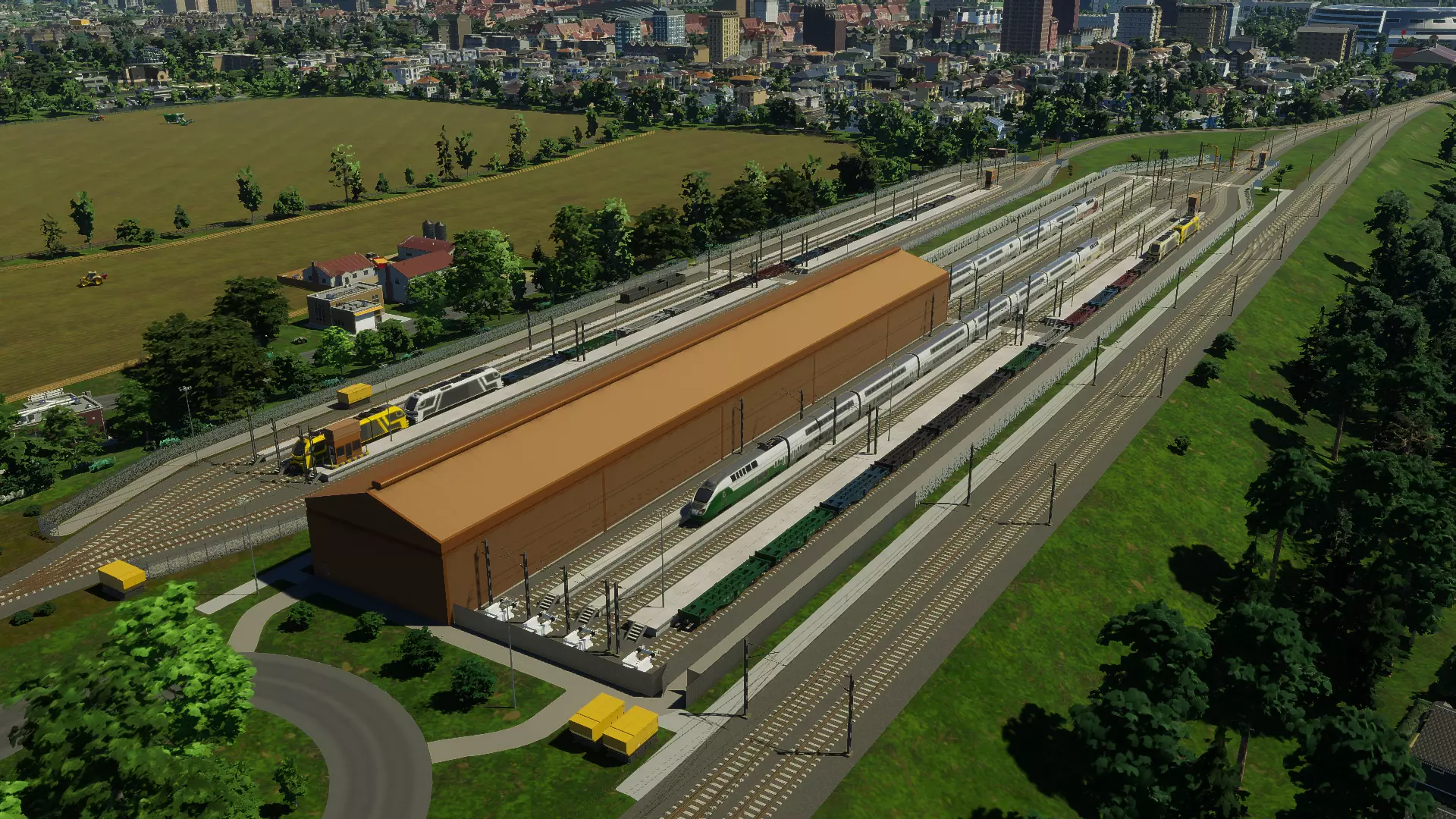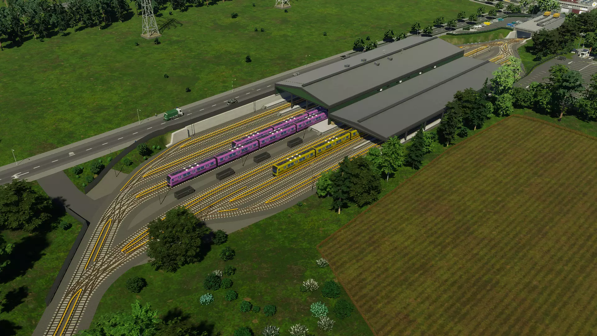 沉没地铁公园 火车交通: 在我为初代游戏制作的原始资产包中也有火车车站,这是我的拿手项目,因为它们是我为该系列制作的首批资产。从那以后,我创作了更多车站资产,无论是通过内容创作者包、免费上传,还是在Colossal Order工作期间参与官方DLC的制作。 与地铁交通一样,这些车站基于越行站和紧凑型变体的设计原则,地标性火车站除外。那个可一点都不紧凑! 包含资产: 紧凑型铁路调车场 沉没式越行火车站 高架越行火车站 城市中央火车站 紧凑型铁路调车场 紧凑型铁路调车场最初是一个终点调车场。该车库的设计与地铁车库和现代有轨电车车库相匹配,采用开放式设计,可看到停放在内的列车,工作人员办公室位于轨道旁的两层空间内。 每条轨道都设有维修平台,当车辆返回车辆段时,工作人员可对其进行彻底检查和清洁。为确保安全,整个场地周围设有围栏。 铁路车辆段还包括一个子建筑升级,即独立的贯通式铁路车辆段,它拥有自己的维修平台和围栏,可在主车辆段周围多次放置。
