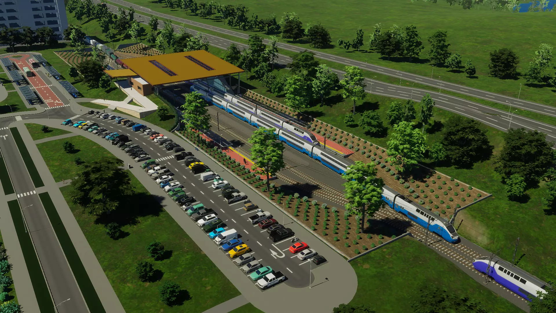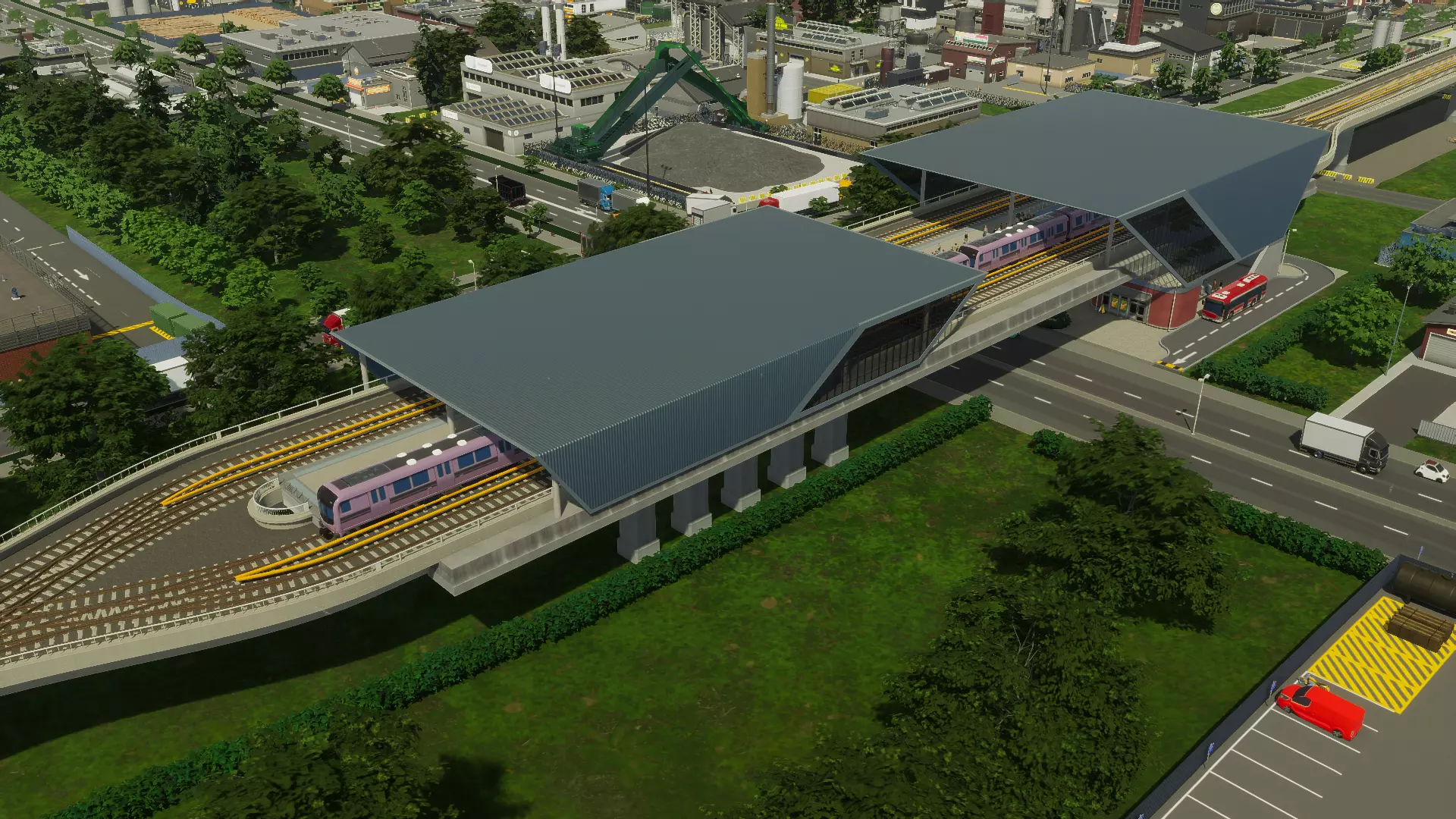 紧凑型铁路货场 下沉式绕行火车站 这是我为该扩展包制作的首批资产之一,仅次于下沉式地铁公园。它设有一组下沉轨道,初始配置为2条内侧绕行轨道和2条外侧轨道服务站台。这使得列车在停靠车站时不会阻碍过境交通,如下方截图所示。 该资产包含内置停车道路、地铁接口升级空间,以及将一段停车道路替换为公交接口的选项。 屋顶设计在两种模型间交替,均覆盖连接站台的天桥大厅。最终可用的升级包括添加一个中央岛式站台,将车站从侧式站台布局转换为4站台车站,并在大厅中央增加楼梯和电梯连接。