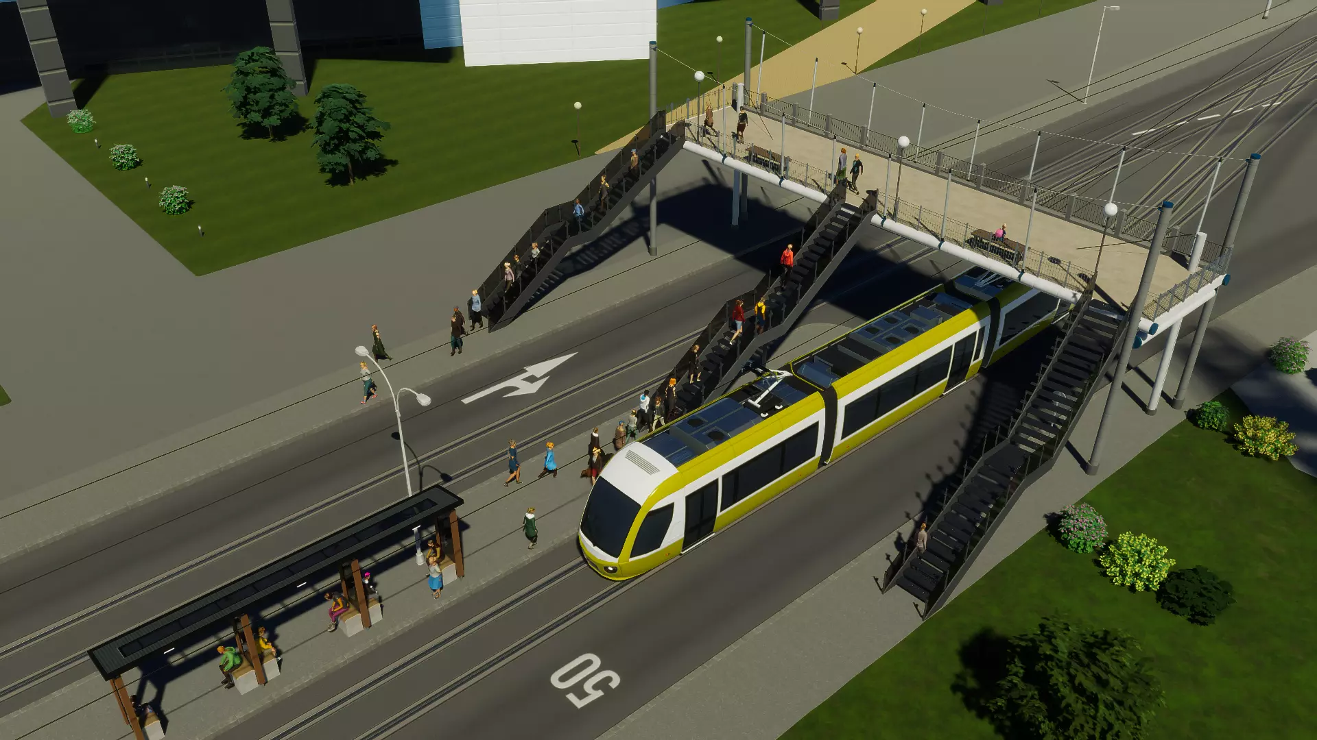 城市中央火车站 人行天桥: 此包还包含新的人行天桥,可在【景观】菜单下的【路径】选项卡中找到。它们可以吸附到道路中央或自由放置——只需确保为每个楼梯连接某种形式的行人通道。 包含资产: 小型人行天桥 中型人行天桥 大型人行天桥 超大型人行天桥 四种尺寸分别对应最适合其宽度的道路,不过较宽的天桥版本当然也可以放置在较窄的道路上。中型、大型和超大型版本还包含一项升级,如果你放置了相应的道路和道路升级,可添加通往宽 median 的楼梯通道。它们与人行横道道路工具配合使用时效果最佳,可用于移除附近的人行横道。天桥还采用了公交站常见的小型屋顶占位符,因此它们会在两种设计之间交替出现,或者完全没有屋顶。此外,天桥还能提供少量的公园吸引力,让市民可以花一点闲暇时间观看车辆往来。如果他们和我一样,可能会在那里坐上很久,只是看着汽车在城市里飞驰。