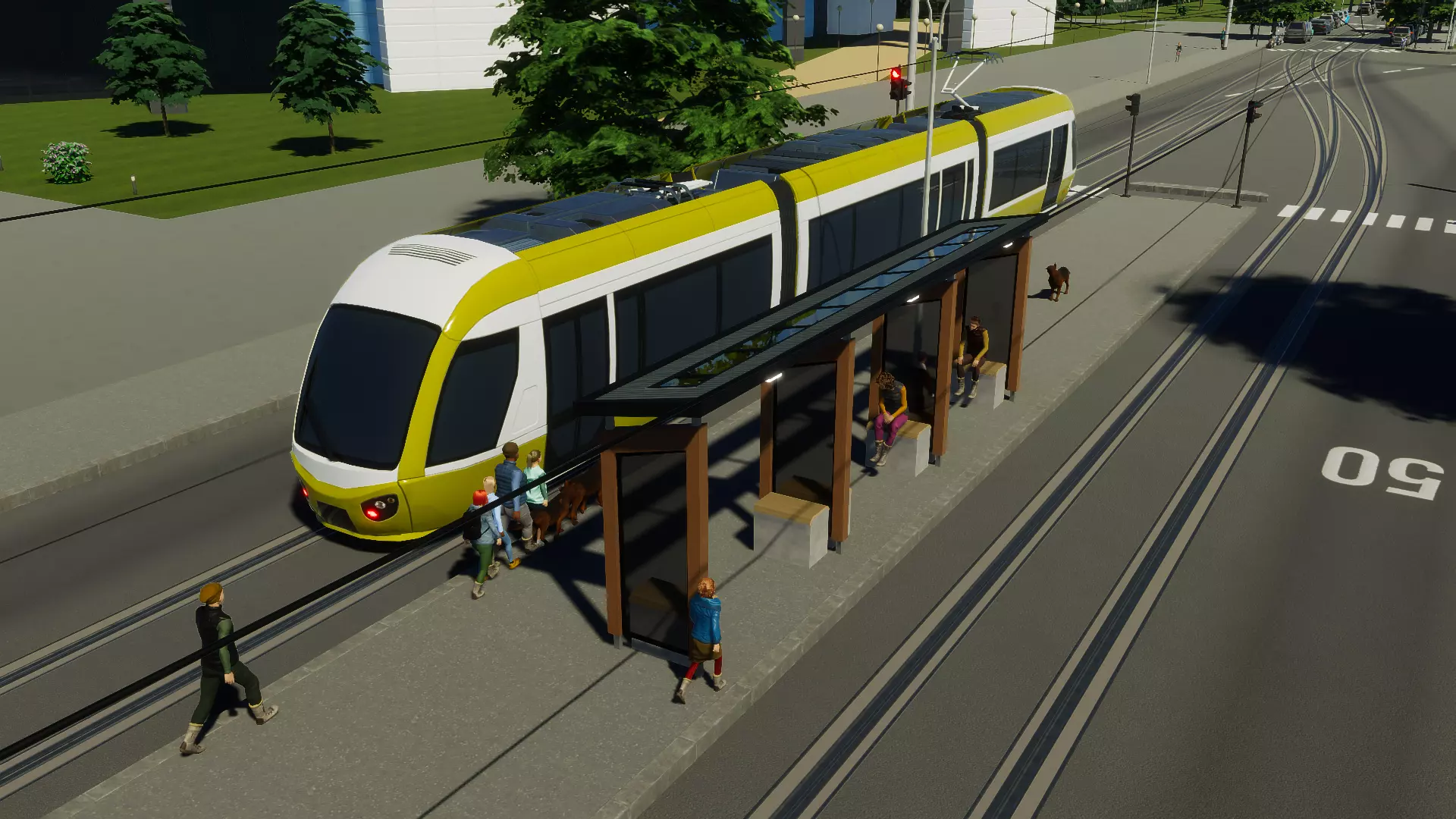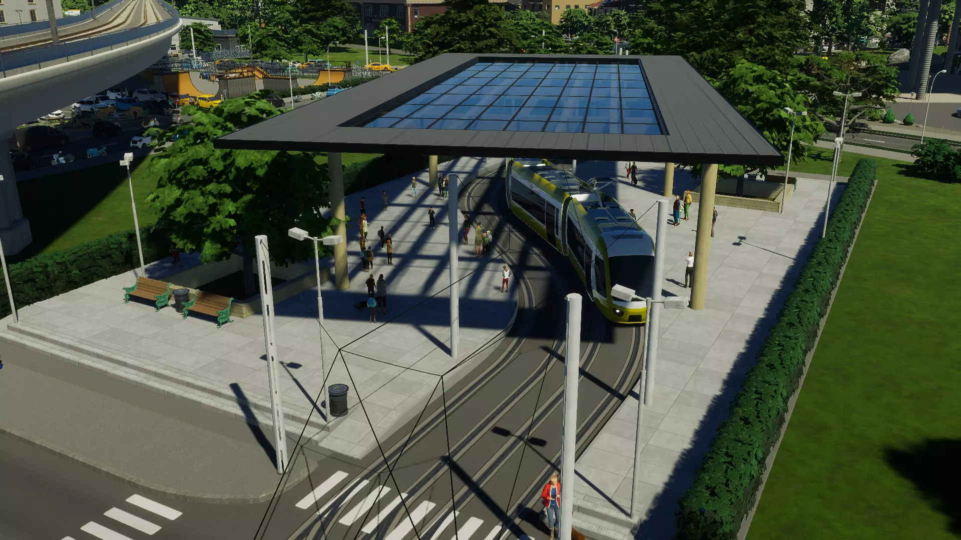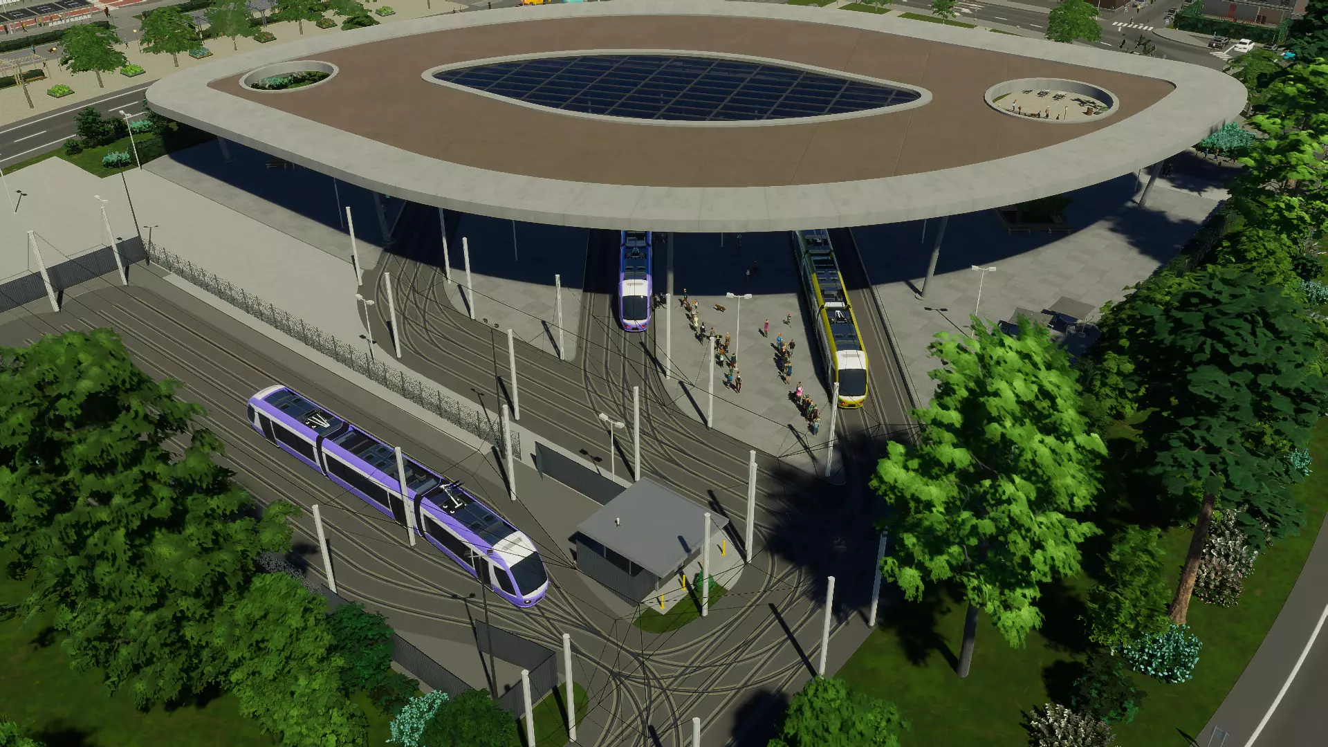 小型电车广场 大型电车广场 大型电车广场是小型电车广场的扩展版本。它为市民提供了休闲活动的空间,同时设有6个电车停靠站台。 其交替式屋顶可为在站台等候的乘客提供遮蔽,并且该广场有一项升级功能,即在地块后方增加一个小型电车停车场,有助于增加城市中可用的电车数量。
