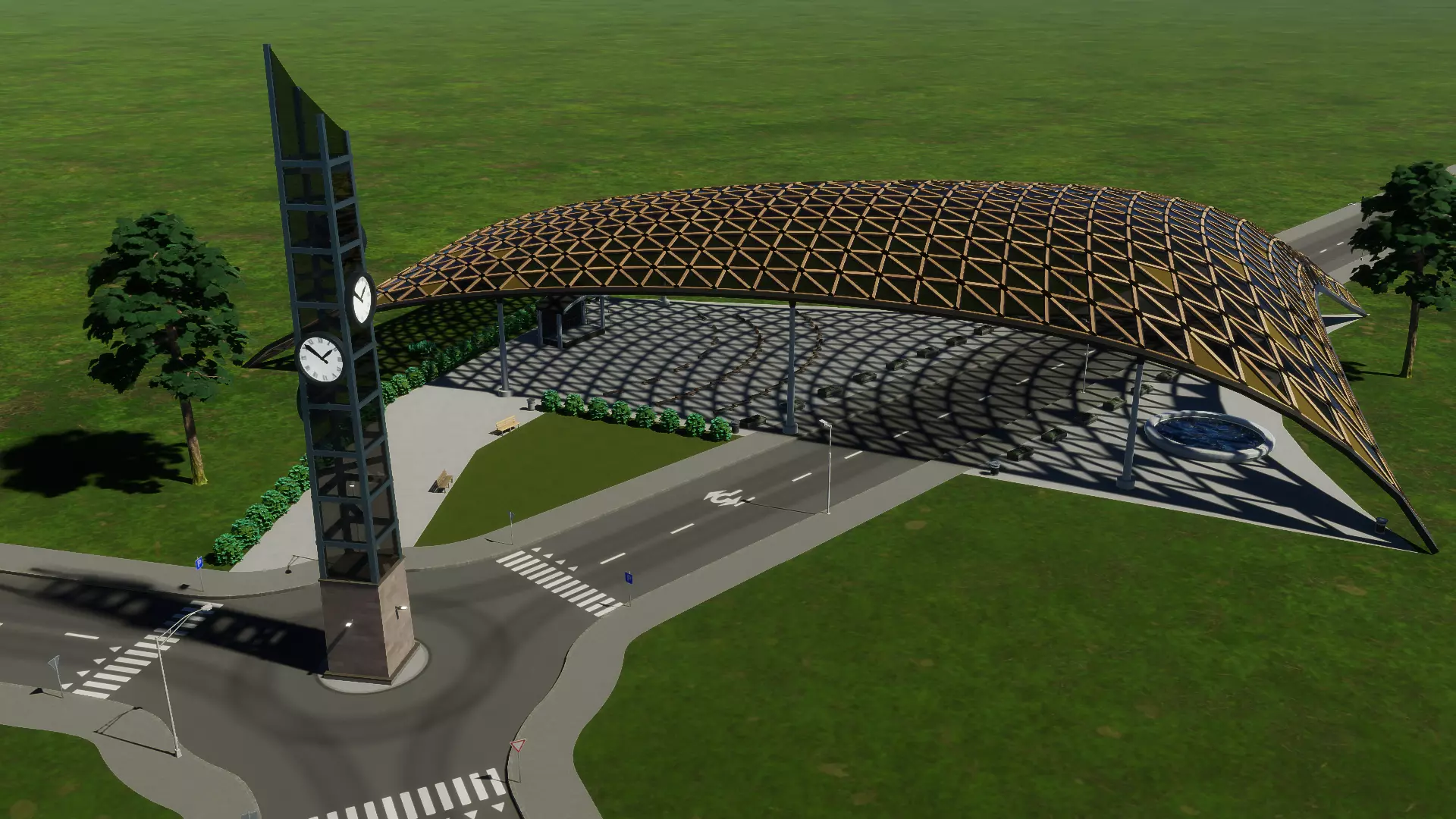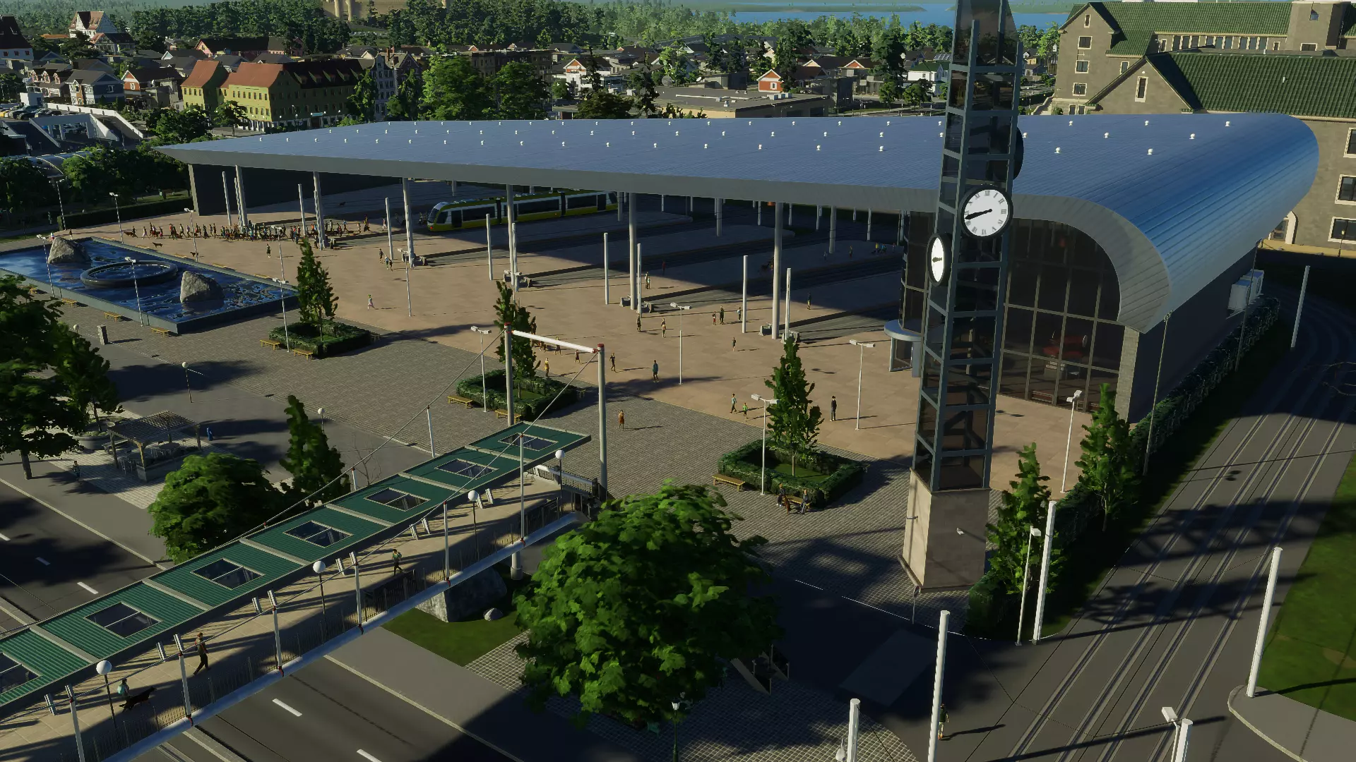 大型电车广场 电车总站广场 作为电车的标志性车站,这是一个大型有顶广场,电车轨道在建筑后方形成环形,设有终点站站台,市民无需穿越轨道即可等候下一班电车。 该广场设有室内乘客大厅,人们可以在此候车、购买食物或取阅当地报纸。广场前方有一座喷泉,与其他标志性车站一样,还设有一座高大的玻璃钟楼。钟楼可通过地铁接口升级替换,使乘客能在广场前方连接地铁服务。 这座建筑的设计在你的城市中独具特色,其灵感来源于我之前为《都市:天际线》制作的模块化火车站,大致借鉴了鹿特丹中央车站的风格。