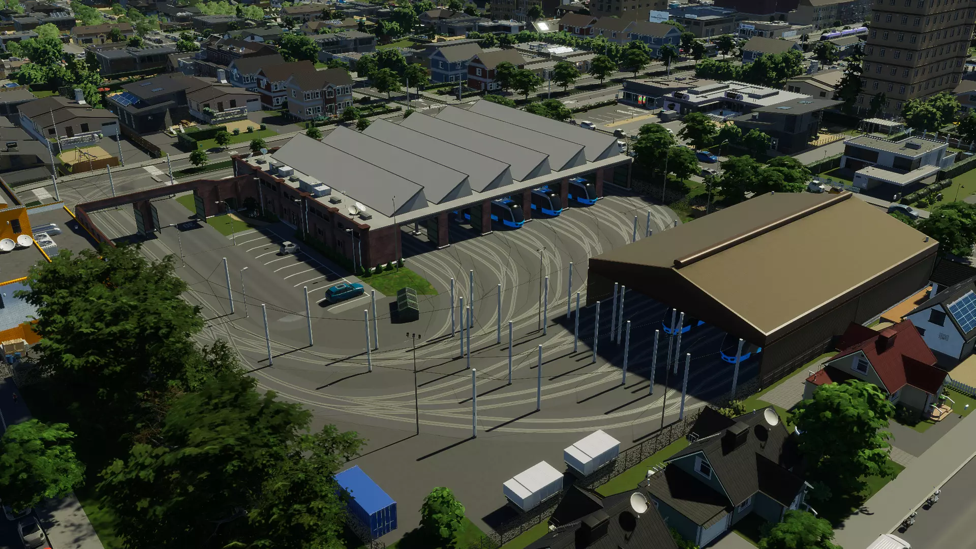 市中心公交站电车交通: 两个电车站设计为广场或人群聚集点的一部分。轨道从前到后贯穿,你可以创建一个贯穿式电车广场,或者忽略后部通道将其作为终点站。 地标资产是一个终点站,电车在后方绕圈,这意味着行人无需穿过轨道即可安全地在站台上等待。 包含资产: 紧凑型翻新电车车库 建筑风格电车停靠站棚 小型电车广场 大型电车广场 电车终端广场 紧凑型翻新电车车库 这个电车车库是我非常喜欢的——它让我想起了我以前住在墨尔本时的那些老式电车车库。该建筑的一大优势在于,相较于其占地面积,能容纳更多的电车。它还附带一项升级,可在地块后方额外添加一个现代化电车车库,为你的车队增加6辆电车。