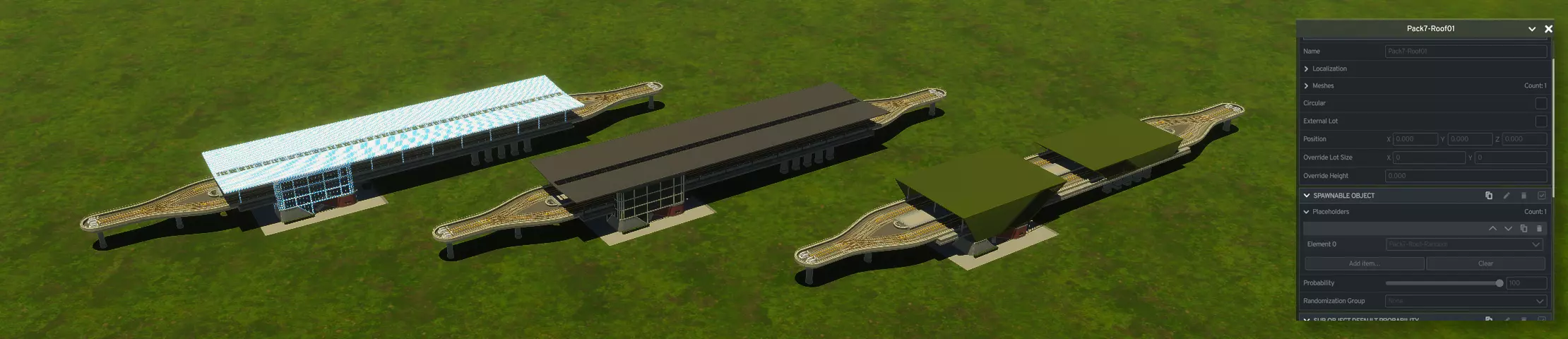 现代中央钟楼作为环岛的摆放示例,以及其中一个屋顶道具的灵活性。 占位符屋顶与模组支持: 此组合包的一大特色是采用交替屋顶设计。每个使用该系统的车站都有其自定义的【占位符】对象。这意味着任何资产创作者都可以将自己的设计添加到随机屋顶库中,供各车站选择。 只要他们设计的屋顶大致符合车站尺寸,只需在新屋顶的【可生成对象组件】中设置自定义占位符对象即可。 作为该概念的示例,下图展示了左侧车站及其蓝白格子占位符对象。在右侧,你可以看到该包中包含的两种交替屋顶设计,每种设计都有其独立的颜色变体,以增加多样性。右侧面板还会显示占位符对象在特定屋顶道具上的设置预览。
