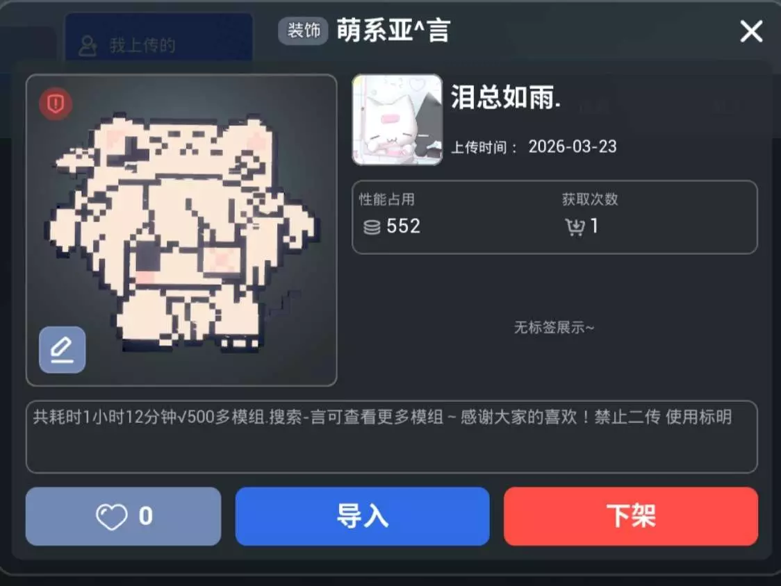 【✎前言】以言温柔为药 治愈你所有不开心✡大家好呀我是小言最近经常制作模组呢,大家更喜欢哪一个呢?本期带来的模组叫做:萌系亚^言✔使用了552个方块组成的素像人物~耗时1小时12分钟!感谢大家的喜欢与支持♕禁止二传 使用标明✭搜索『言』查看更多模组!各种模组敬请期待~