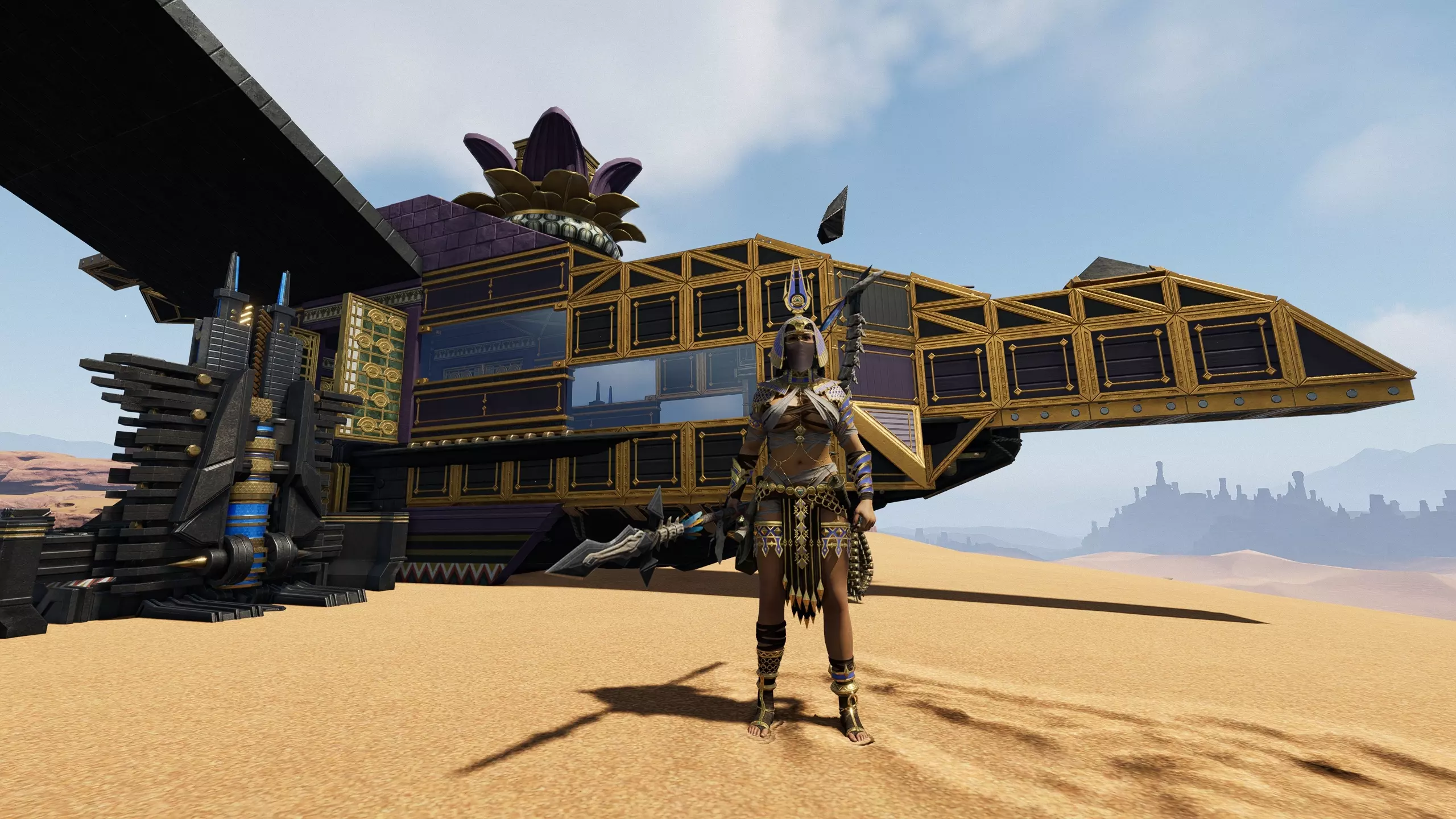 但——这一系统的真正深度尚未揭晓……最终——面甲是你最伟大的战利品 面甲是金沙之地最顶级的战利品。每一副面甲都是你亲手击败某位神明守护者的证明——证明你曾带领族人乘坐飞艇穿越酷热沙漠与沙暴,突破沙匪的封锁,深入最致命的遗迹,最终站在巨兽的尸骸旁,心中涌起那股难以置信的成就感:“我做到了。” 然后你戴上它,重返世界,昂首阔步,仿佛这片土地尽在掌握——这正是我们希望每位族长都能拥有的体验。 而如果说面甲是你的力量,那么金沙之地还有你的家园——你的飞艇。