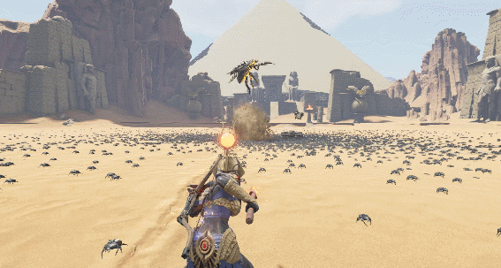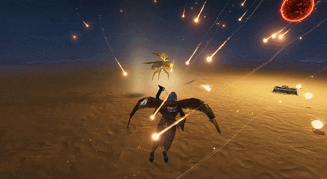 在【灵魂面甲】的【流沙】DLC中,我们真正想要实现的是:面甲不应仅仅是另一个系统。它应是一段完整的旅程——从一名普通的幸存者,蜕变为真正能与神明并肩之人。 在金沙世界里,面甲的力量直接源自曾统治这片土地的神明。每一副新面甲都是神圣权威的化身。 而获取它们的唯一途径是:找到并击败创世神明所创造的守护者——那些掌控神圣力量的巨兽。 收集材料,从基础的骨制装备开始。袭击蛮族营地以招募精英战士,夺取他们宝箱中隐藏的材料和高级武器,武装你的战团——然后向金字塔进军。 并击败它们。荷鲁斯,天空之神 | 飞行、自由、探索