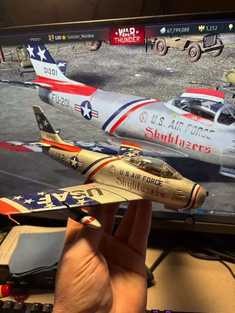 一架1/48比例的北美F-86F模型,带有美国驻欧空军“空中火焰”飞行表演队的涂装!由Sinister Monkee制作。