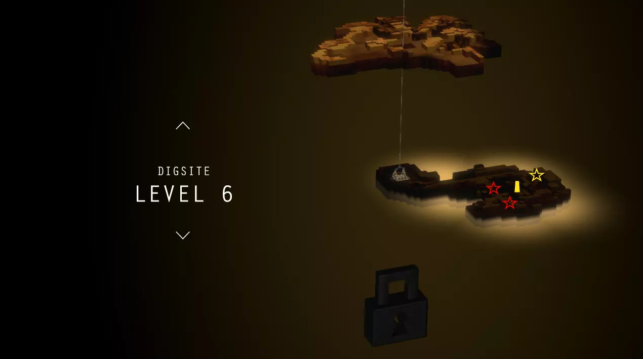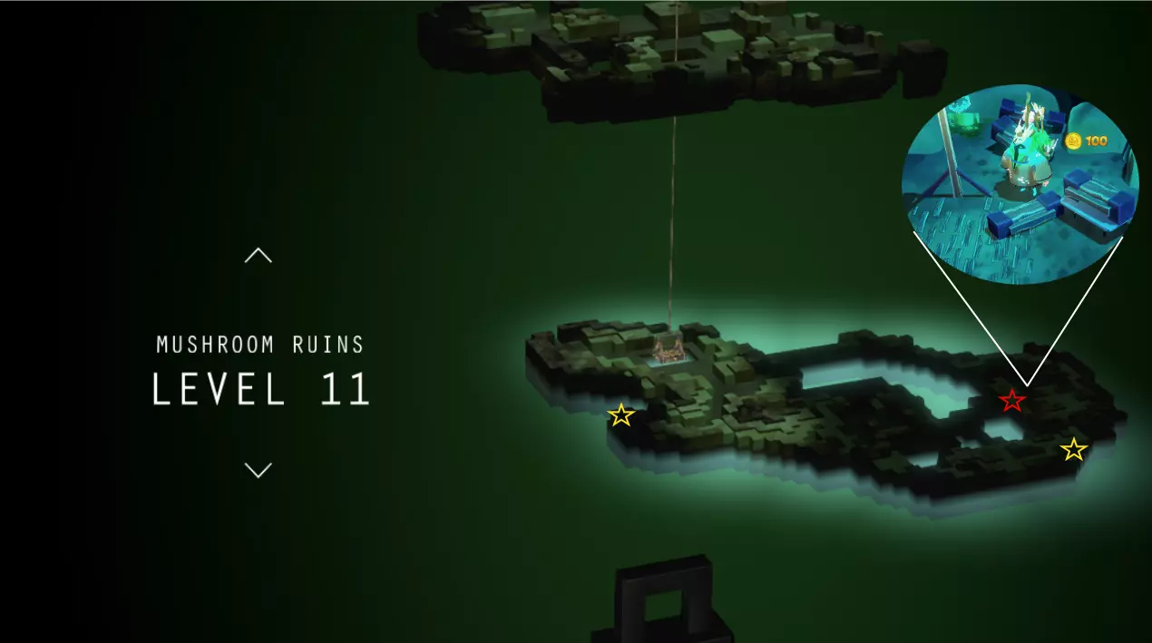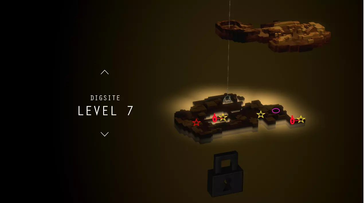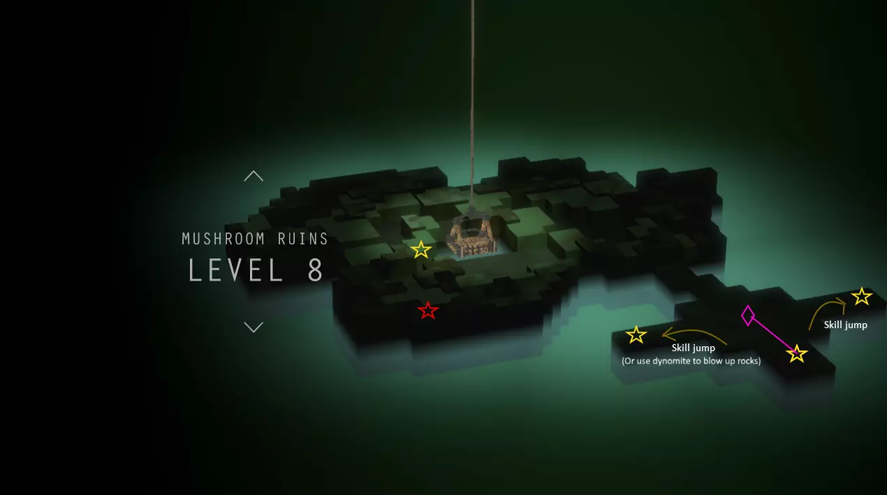 简单地图上标记了日志页(星星)、黄金偶像(方块)、能量泉(圆圈)和店主。需要挖掘的日志页用红色星星标记。挖掘场