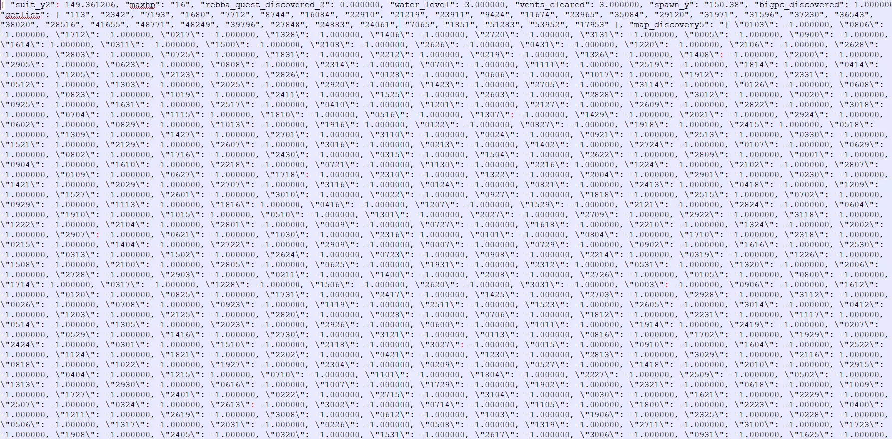 这很正常。别慌,如果你现在正在慌,停下来。我们要做的就是修改几个特定数值。使用你的文本编辑器中的文本查找功能,找到以下文本片段: "map_start": "map6" "room_start": "2522" "hassuit": "no" "gary_defeated": 1.000000 "spawn_x": "56" "spawn_y": "152" "success": 1.000000(如果找不到其中某个,试着只搜索前半部分——它可能略有不同) 然后,将这些文本片段分别替换为列表中对应的文本: "map_start": "map5" "room_start": "1316" "hassuit": "yes" "gary_defeated": 0.000000 "spawn_x": "208" "spawn_y": "150" "success": 0.000000 完成后,保存并关闭文件。 步骤3:完成!如果你操作无误,现在应该可以加载存档,并发现自己就在实验室入口外。