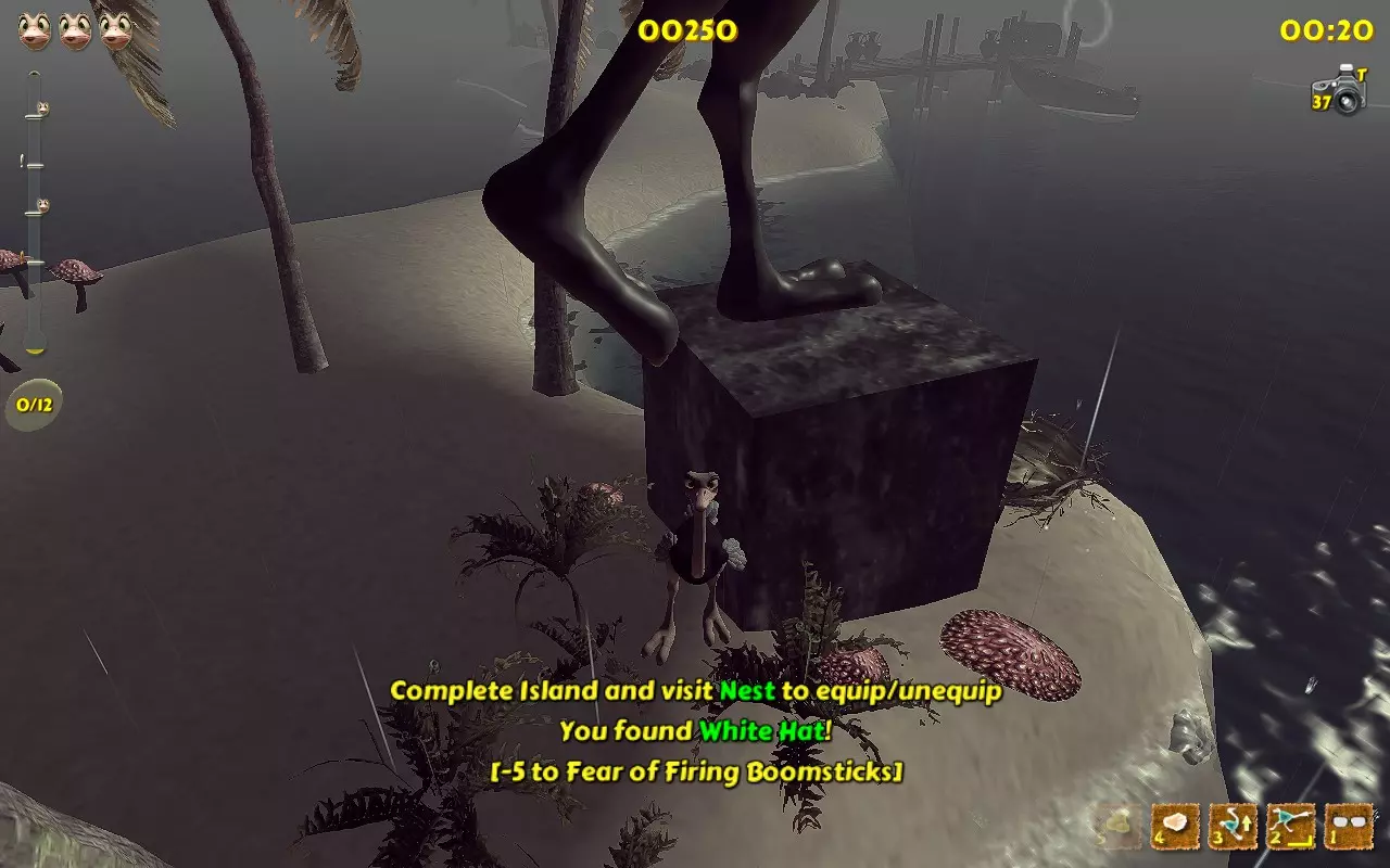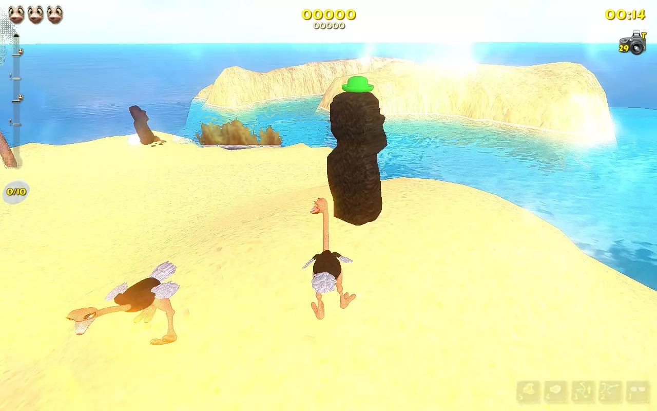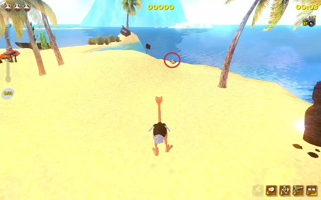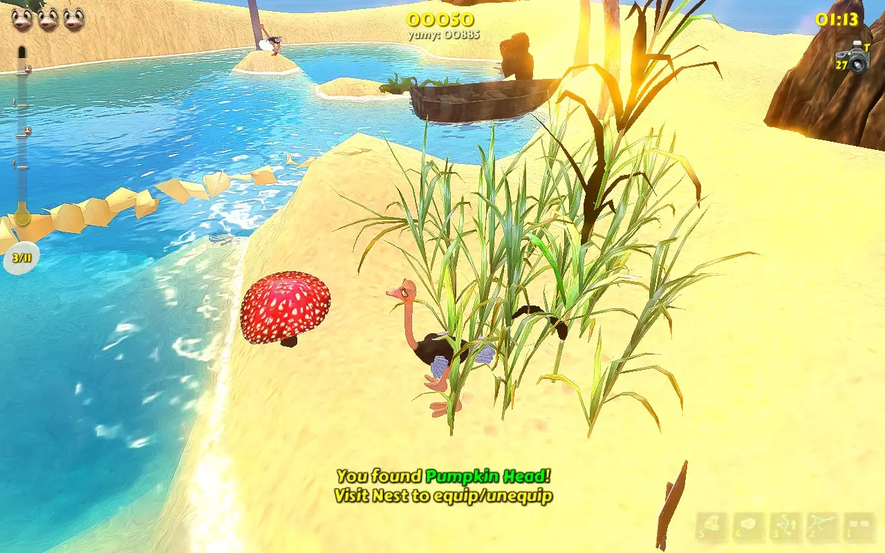 你带着至少3只雏鸟走在沙滩上。 1.获取第一个伙伴(小鸡,动物)。要做到这一点,你必须先前往13号岛屿。接下来,只需在13号岛屿上游玩,通过将母鸡踢向大门来“拯救”它们,然后等待金色小鸡最终出现。这种小鸡的出现几率不高。一旦你看到这个黄色生物,就冲向它并踢它。它会掉落一个蛋,你需要捡起这个蛋。恭喜你,你获得了第一个伙伴动物。 2.喂养你的小鸡。它以瓢虫和水果为食。而且,必须由它自己捡起食物。难点在于你无法控制它,但很容易不小心踢到它或给它提供食物。和以前一样,棕榈树在这里很有用。把食物丢给鸡,踢一下它,等它进食,观察小鸡变胖的过程。 3. 等待你的鸡下蛋。道理很简单:我们喂食,我们等待。恭喜你,又多了一个宠物! 4. 现在你需要养第二只鸡,等它下蛋。 这个过程有些枯燥,因为有几个注意事项: 1. 不要踢你的宠物,否则它们可能会离开。踢5下=失去小鸡 2. 每只鸡只能下一个蛋。等它下第二个蛋是没用的。 3. 致谢 Easy Target的原始致谢页面: “我要向以下人员表示感谢: 用户Chris Fifty-Two,感谢其在游戏机制研究以及阐明达成各项成就所需条件方面提供的宝贵帮助。 用户Dinopunk,感谢其提供寻找所有照片的指南。 YouTube用户Roy Hess,感谢其制作的视频攻略。 感谢开发商MeDungeon Games创作了本游戏并提供真诚的技术支持。” 额外感谢: 感谢Easy Target创作了原始的俄语指南并整合了所有成果。