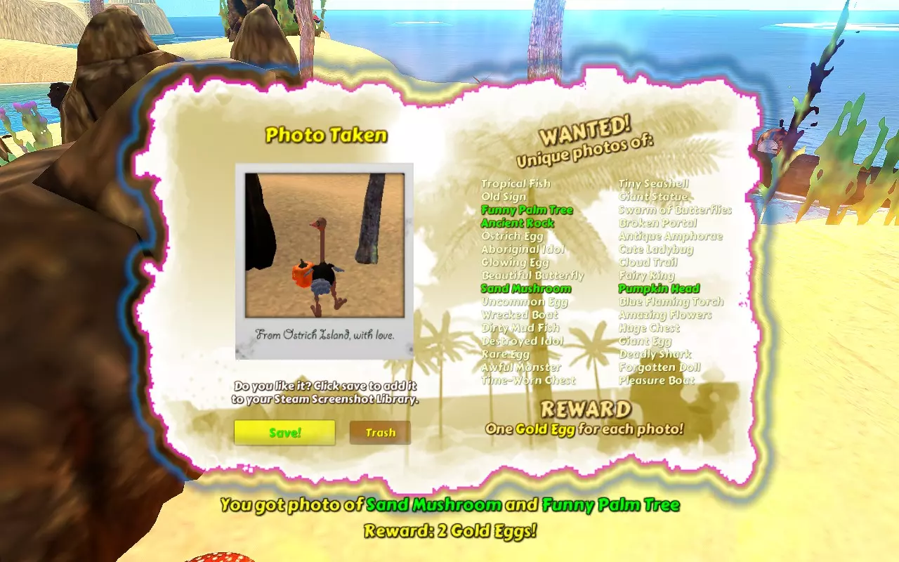 成就:Paparazzi 你完成了鸵鸟岛美景照片的收集。 拍摄岛屿上所有的事物。拍摄时需要靠近物体才能被计入。 需拍摄物品清单(绿色表示已拍摄)。一张照片中可同时拍摄多个物品。