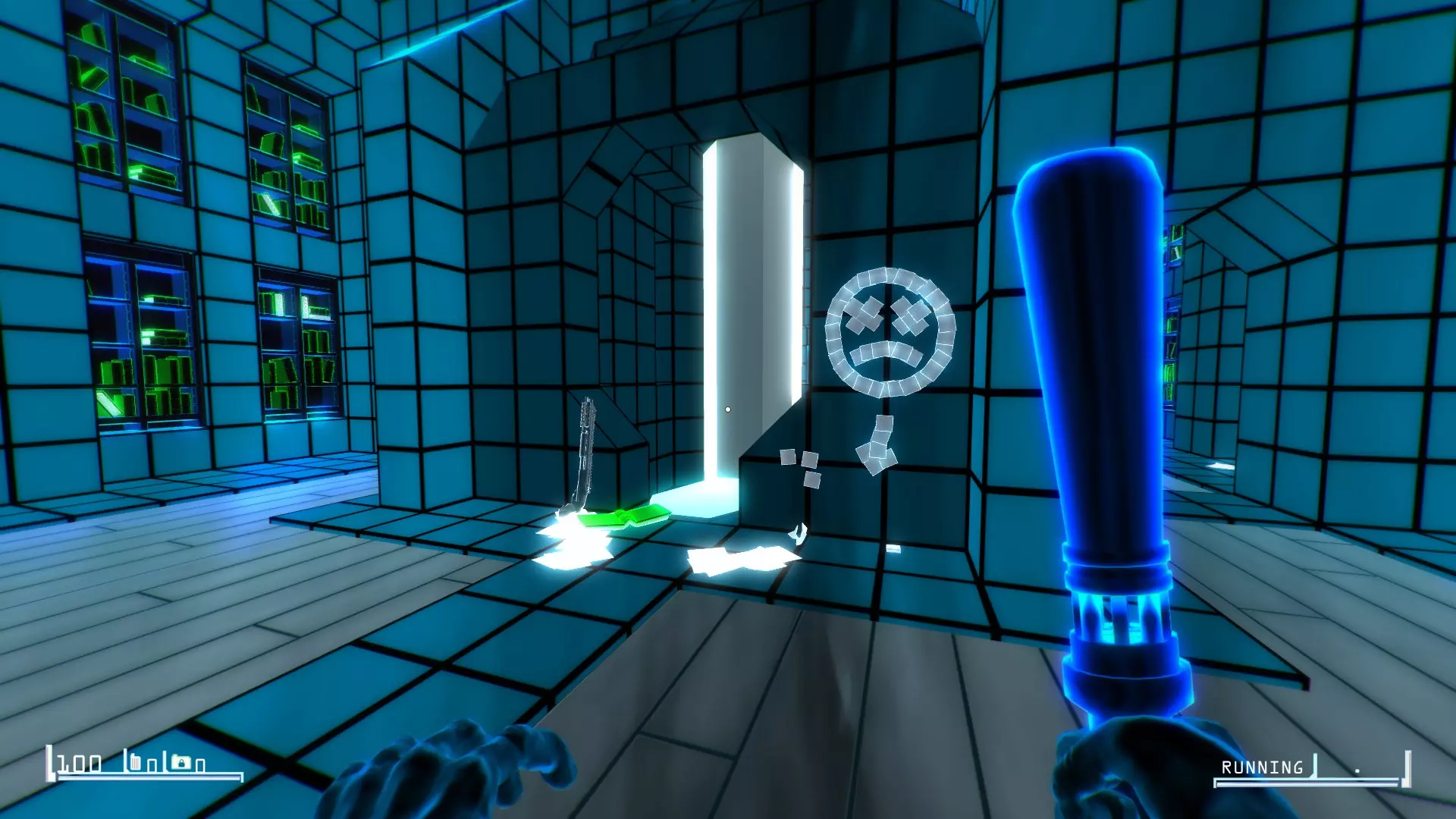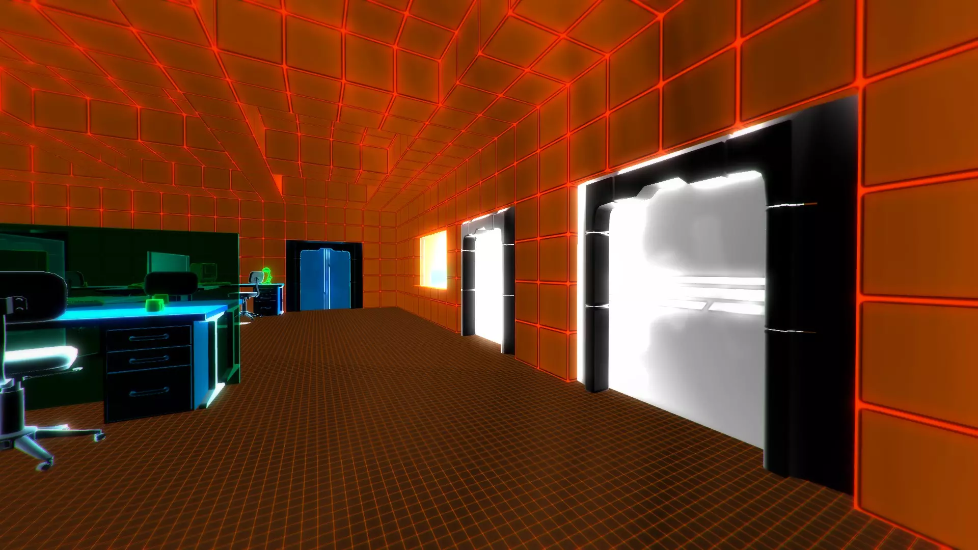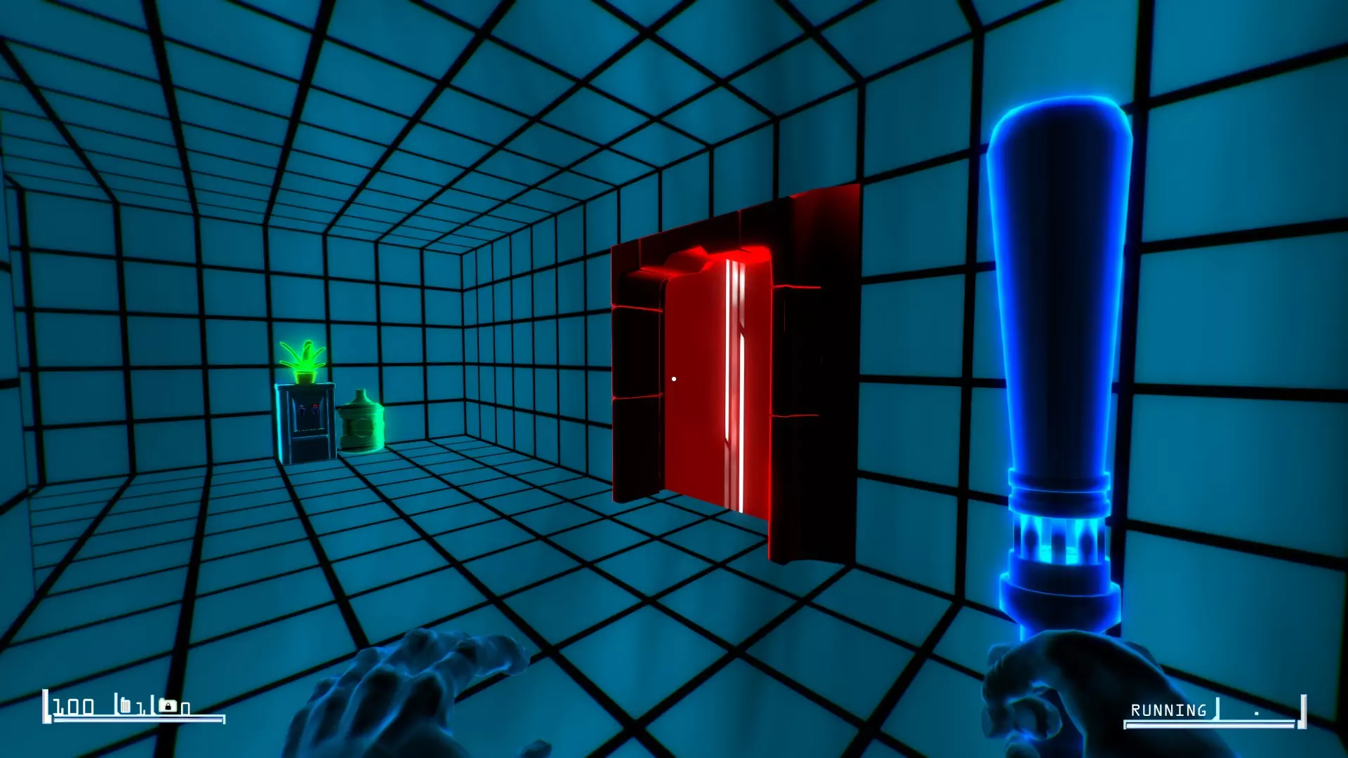 从第一个大房间的远端通过蓝色门离开。
