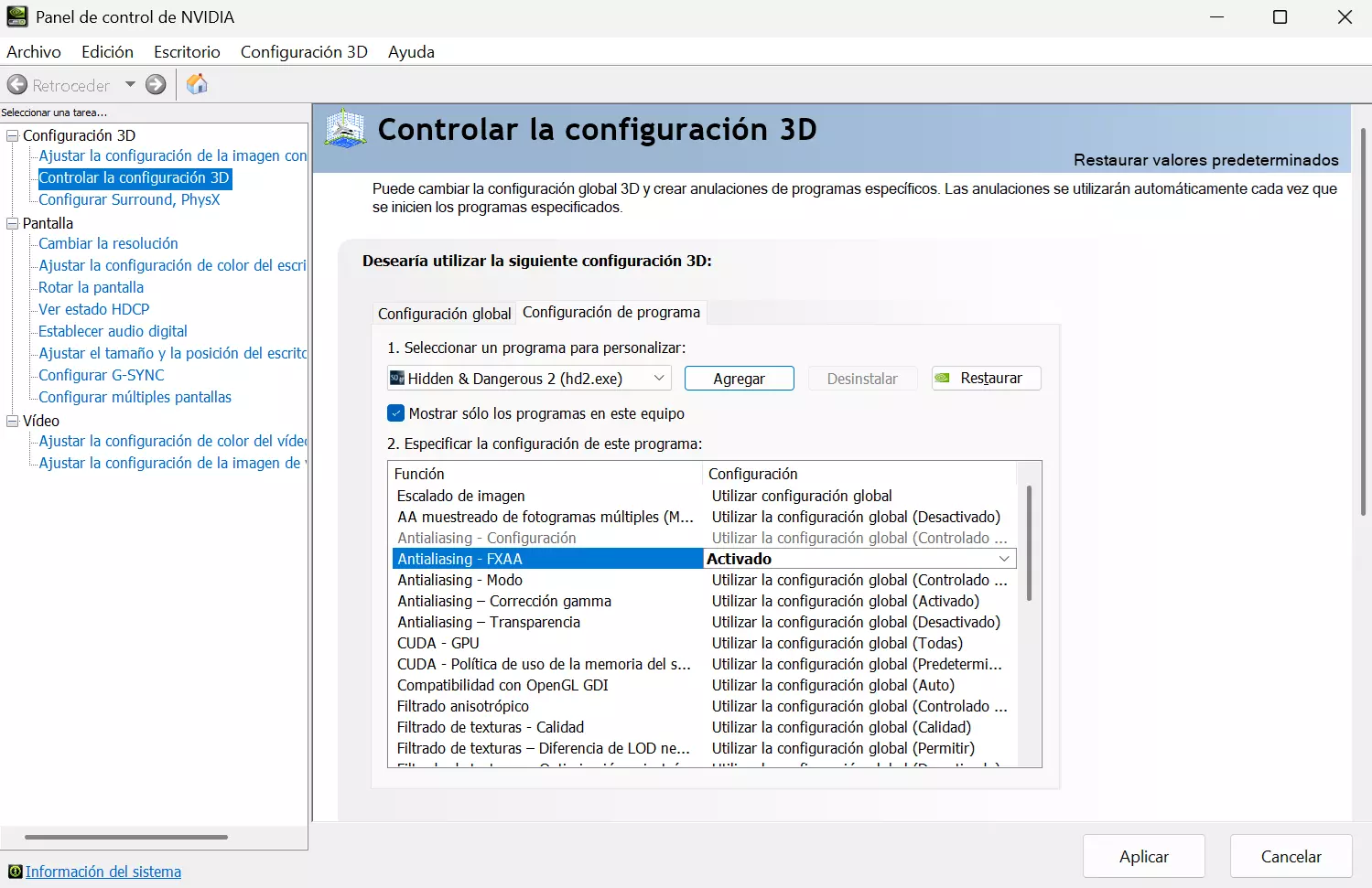 将文件解压到游戏目录即可!现在我们可以使用自定义分辨率进行游戏了。 在显卡中启用FXAA 要平滑这款游戏的边缘,我们需要进入显卡控制面板,按应用程序启用FXAA。