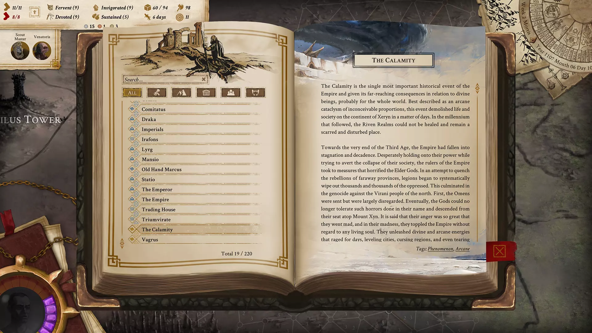 “仅仅几天后,泽林就从一堆废墟和被诅咒的荒芜土地,变成了比这更糟糕的景象……‘最终,众神再也无法容忍以他们之名犯下的这种恐怖行径。一系列神谕早已预示的事情发生了,他们降临到帝国之上,试图纠正错误。在这场被称为浩劫的可怕连锁事件中,他们在短短几天内就毁灭了帝国。据说,众神后来在愤怒和震惊中看清了自己的所作所为。悲伤和羞愧击垮了他们,他们选择永远离开这个现实。’ ——阿戈斯,年迈的旅行者 浩劫,即便不是整个世界,也是帝国和泽林大陆历史上最重要的事件。”一切都已改变;自然法则在诸多地方不再适用,现实的结构已然崩坏,所有相关文明都发生了不可逆转的变化,宇宙的创造者也已消失无踪。从那时起,一种新的历法开始被使用。而这一切,都始于毁灭前约一个月的【预兆与征兆】。 【预兆与征兆】 “从天而降的东西一点也不像雨,更像是血。但这也不对。凑近细看,它像是一种带有深色纹路、油腻的深红色物质。它似乎能自主移动,并汇聚成水洼般的形态。在它汇聚之处,无数细小的黑色物体将其包裹。尽管佩罗迪乌斯警告过我们,有人还是触碰了它,结果在几秒钟内就被活生生地吞噬了。”尽管今天帝国中一些不太爱国的公民对这场英勇斗争的成功表示怀疑,但历史学家和神职人员指出,强大的首都泽林城的大部分地区以及熔炉最古老省份的部分区域都幸免于难。这场行动名为“永不放弃”,在灾难周年纪念日,也就是泽瓦鲁姆月24日(该月名称源自古老的月神徐娜,灾难后更名),帝国公民会庆祝帝国节,纪念对抗叛逆神明的胜利。 不幸的是,帝国本身在与那些狂暴能量的战斗中受到了可怕的重创,为了生存和恢复,陷入了深度沉睡。哦,这种状况已经持续了一千多年,他被囚禁在大教堂最深处的房间里,只有最亲近的侍从——哈瓦里尔和奥尼基勒——能够见到他并照料他。奥尼基勒也在“猎获”仪式上做好了准备,并且也未能毫发无损地脱身。当众神袭击首都时,他们的血肉从骨骼上消融,但皇帝将他们的灵魂束缚在了这些骨骼中,使他们以新的形态得以存活。奥尼基勒作为强大的不朽巫妖重生,在他沉睡期间继续侍奉神圣陛下。是他们重新组织了帝国。在皇帝醒来之前,是他们管理着这里。 灾难 第二部分“.” - 幸存者的文字记录(灾难发生前4天) 帝国已处于内战边缘。在种种暴行中,尤其是在叛乱国家维拉恩发生的大屠杀,十二灾厄决定以此为范例。当数十万维拉恩人被处决时,最初的预言开始显现。起初这些现象轻微却依旧诡异:牛奶瞬间变质,庄稼在几小时内成熟又枯萎,夜晚的风中传来令人毛骨悚然的声音,河流倒灌,疯子以极其烦人的方式陷入疯狂,动物也开始随机迁徙。据说卡迪姆诸神再也无法忍受帝国的压迫以及以他们之名所行的恶事,许多人认为,从过去来看,预兆本应是他们的警告。然而,在十二贤者的命令下,这些既有趣又具威胁性的现象被忽视了,并被当作是诸神因叛逆的民众而发怒的表现。不朽的皇帝保持沉默。灾难发生前大约一周(在徐奈斯月16日),各种迹象开始变得异常,而且无疑变得更加猛烈。有些地方从天降下类似血液的物质,有些地方则下起了酸性雨水。可怕的风暴席卷着各省,致命的飓风和洪水则侵占了海岸。世界开始摇晃,整个自然界陷入恐慌与混乱。神权政体的侍从们命令民众向皇帝祈祷。帝国的大多数子民都认为世界末日即将来临,因此不出所料,许多人要么变得宽容,要么陷入暴力疯狂。 大灾变 “仔细观察后会发现,所有的奇术证据都指向一个神秘事件。虽然难以确定该事件没有产生任何影响,但通过应用贝瑟纳斯的理论,我们可以找到足够的当代例证。该理论认为,当今异常现象的隐藏踪迹或共振根源存在于大灾变之中,因此它们必然共享相同的隐藏特性。”因此,我们所说的灾难,即引发那些看似超自然现象的一切事物,其起源和本质几乎可以完全确定是魔法性的。[...] 考虑到事件期间所描述的所有部分的范围和多样性,实现此类成就所需的魔法能量只能用宇宙级来定义。[...] 这或许意味着,除了神明之外,不可能有其他存在能够提供这种能量。 ——摘自红色教派大导师瓦尔达尔在元老院的官方报告(前历法797年) 灾难始于旧历最后一年(新历法2793年)的 Xunais 月24日。有几位当代学者称,太阳在正午时分静止不动,不再移动。天空在各地发生了不同程度的变化(其中最明显的变化发生在大陆的南部地区),并且各地都持续数小时听到了不断增强的尖锐嗡鸣声。最终,天空裂开,末日降临。没有两个地区的命运是相同的——或许是从天而降的众神那无情的想象力没有边界?有些地方被熊熊燃烧的陨石雨吞噬,有些地方被海水淹没,还有些地方陷入了无形的绝对黑暗之中,巨大的恐怖建筑倒塌,吞噬了人们。几座城市消失得无影无踪,未留下任何痕迹,另一些则被可怕的魔法诅咒。黑暗的活云降临大地,吸干了人类、动物乃至植物的生命。毁灭性的能量流在四周盘旋,时不时便会夺走生命。不祥的迷雾笼罩着聚居地,只留下一具具凝固着恐惧表情的尸体。 没人能看清或说出这场灾难的起因,但大多数人都坚信,这是众神为了惩罚他们的帝国而显现的怒火。然而,如果说这一切的目的是惩罚,那显然是做得太过了:这场灾难发生仅几天后,泽林大陆就沦为了一片比熔岩与被诅咒的荒漠还要糟糕