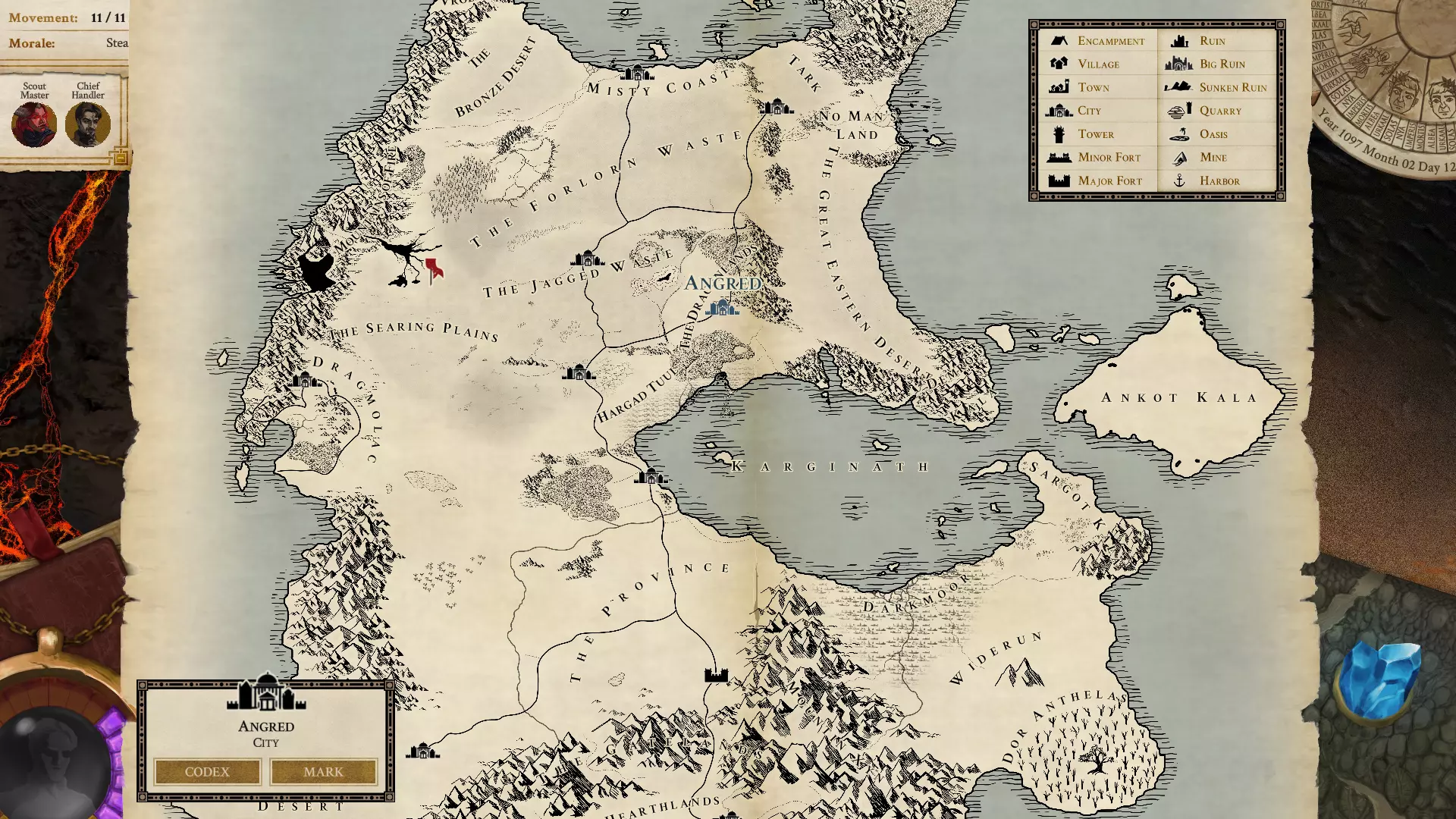幸存者 “卡拉米内”?哈!我亲眼看着你们的帝国在硝烟与火焰中崛起。我的人民,我们遵循灵魂的法则:沙利米。所以我们从不向德克马哈低头。 ——雇佣兵维库贾姆比 灾难中的幸存者要么是极其幸运,要么是极其强大,要么是听从了预言并为世界末日做好了准备。幸运者大多身处“牺牲”所守护的少数地方:泽林城以及一些最古老行省的部分区域。强大者,比如卡尔克波利斯的巫师学院议会,成功用强大的魔法保护了他们城市的部分区域。还有一些人则观察着征兆并给出了不同的解读。许多将这些事件视为神圣警示的反对派高级祭司及相关领袖,为保护其信徒采取了措施。这些措施大多包含被称为“calerus”的各类避难所。有些堡垒是天然的地下洞穴系统,而另一些则因不同原因而建造。其中相当一部分在灾难期间及之后成功挽救了躲入其中之人的生命。 还需提及大陆上某些完全避开诸神关注的特定区域。永恒雨之地达贾马哈以及将其与塔尔克分隔开的阿图克山脉,已证明是国家半数人口的巨大避难所。沙杜克部落重新部署了他们用于侵占大陆的船只,在海洋中等待着最恶劣的风暴过去。不幸的是,这些族群后来也因灾难的魔法蔓延以及其他所有地方的彻底毁灭而遭受了巨大的痛苦。 绝罚 旧神的背叛改变了我们的世界。巴尔·乌尔·卡尔告诉我们,引发他们神圣怒火的是嫉妒。看到我们的繁荣、幸福、自由,以及最重要的——凡人种族的潜力……那种如同神圣陛下们崛起一般的崛起潜力……彻底激怒了众神。“因此,他们带着盲目的怒火触碰了这个世界,而这触碰的印记将永远提醒我们他们的背叛。但哪个父母会做出这种事?哪个父母会抛弃自己的孩子?没有所谓的旧神指引,我们反而过得更好。现在,我们自由地塑造自己的命运!” ——引自三巨头教皇盖卢迪斯在灾难周年纪念上的布道 灾难之后,古老的神祇们离开了这个世界。他们不再回应祈祷,也不再为神职人员提供魔法能量。没人知道他们去了哪里,也没人知道为何无法再联系到他们。很久以后,人们尝试前往希恩山(并非首都附近的普通山脉,而是位于外部王国的那座具有形而上学意义的山),但历经艰险穿越被恶魔侵占的空域后,幸存者们却发现山门紧闭,整个领域看似已被遗弃。幸存者们的震惊迅速转化为对神明的愤怒。不久之后,残存的陵墓与神庙被摧毁,那些躲藏在地下或魔法避难所中的人们开始公然挑战神明。多数情况下,拒绝背弃神明的祭司遭到杀害,这场清洗最终导致许多古老的宗教传统失传,旧信仰也被有效地掩盖。此后的数百年间,迎来了一个无神的时代。然而,古老神祇留下的这种空白,渴望在宇宙层面得到填补。没过多久,强大的存在便应运而生,并将自己确立为新的神祇,他们提供力量,低语着复仇的承诺。几代人之后,人们接受了新世界的压迫,也随之接受了新的神祇。帝国以其更为黑暗的旧貌重新建立,而三巨头则成为了它的官方宗教。