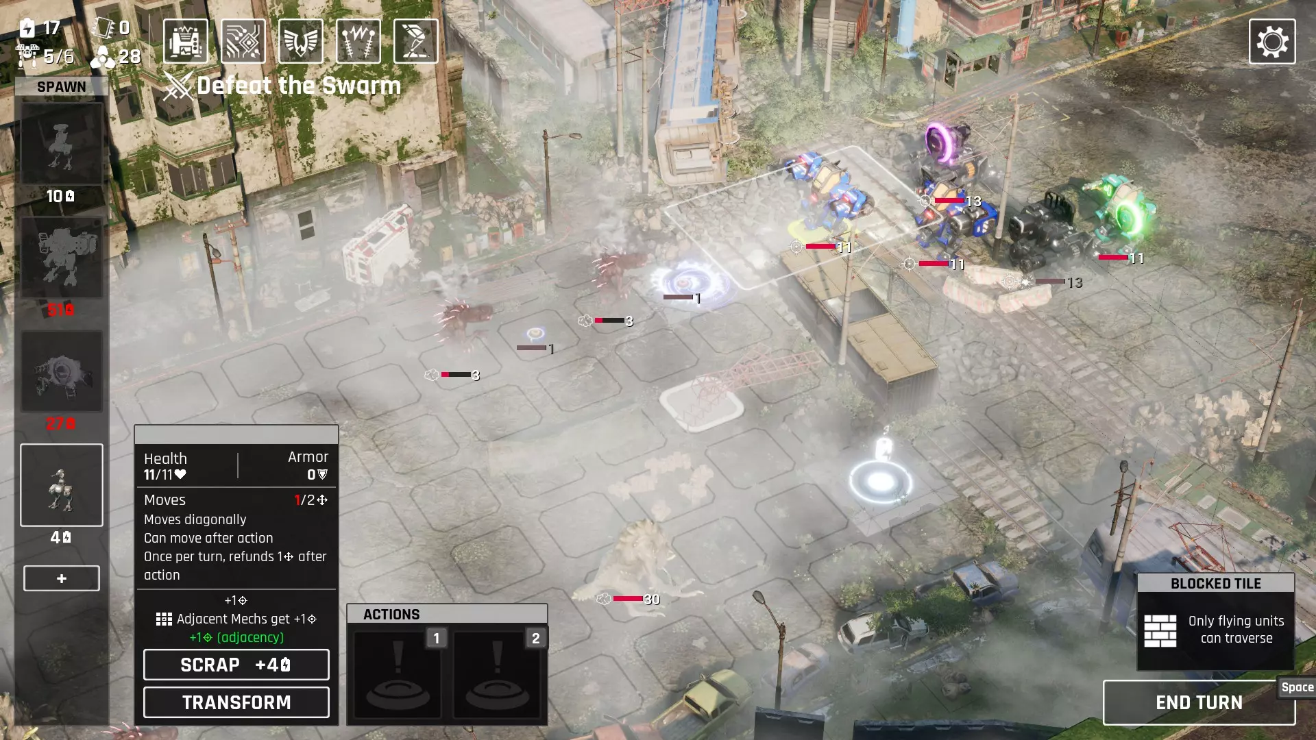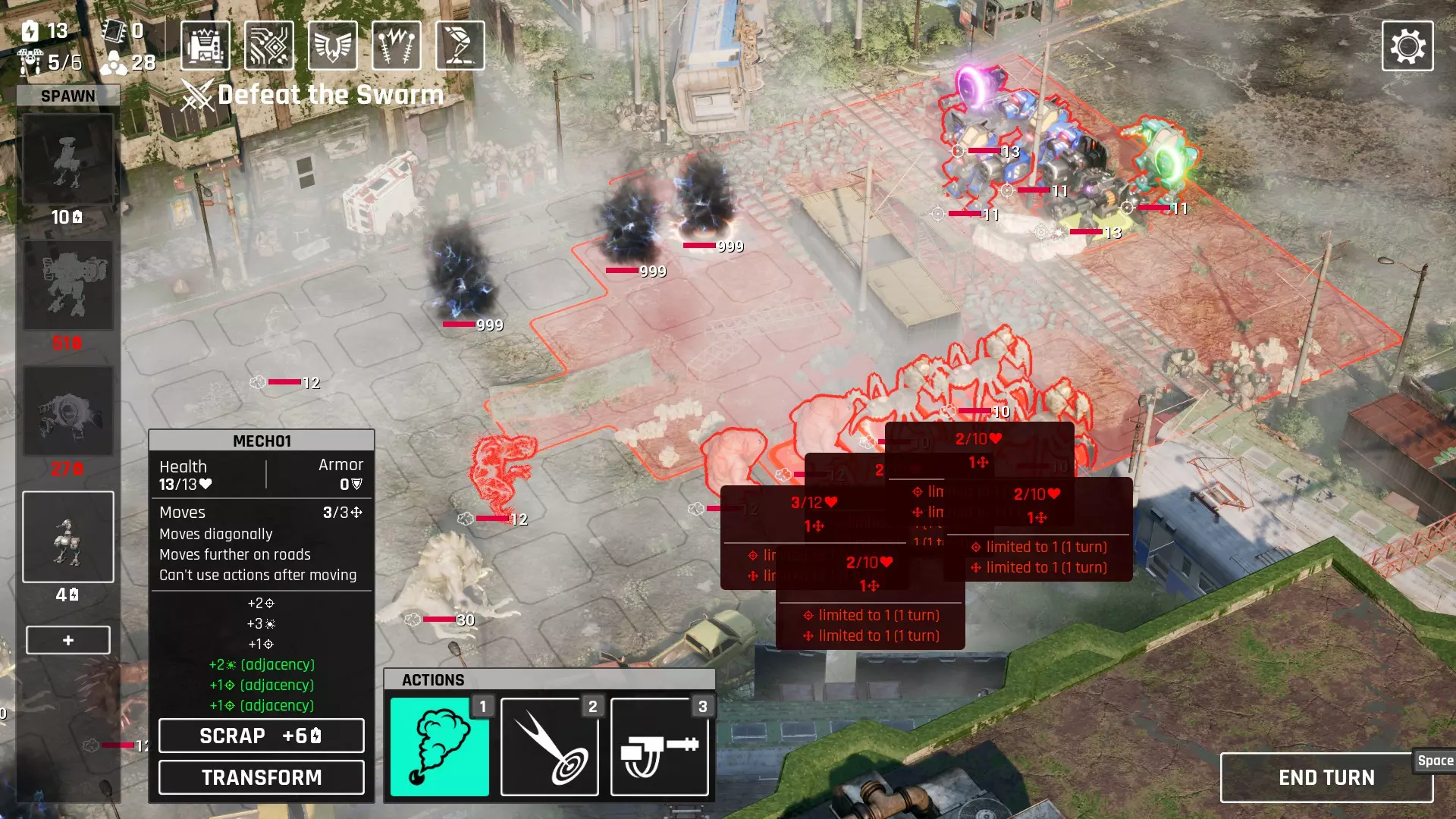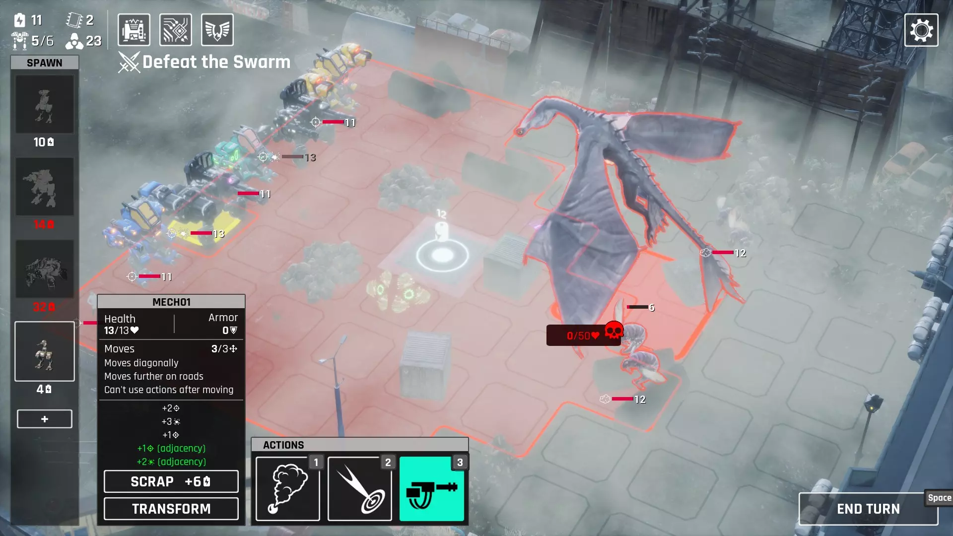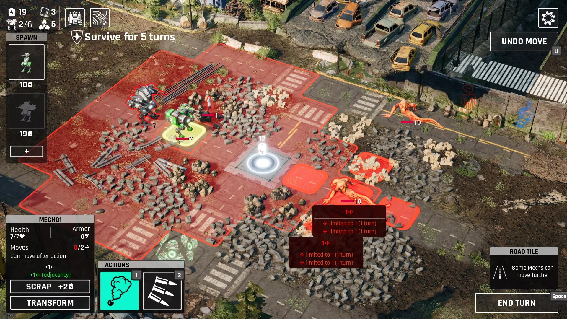 接着,我们注意到它在3.0升级后拥有+1射程、+2射程和3点伤害。这些射程意味着它可以充当【移动炮台】,而且对于多次攻击的机枪来说,+3伤害也很有用。问题在于,它的射程并不能弥补其缺点。我们需要为它提供一些掩护。但当能量和武器都用在这个炮台上时,护航单位的火力就不足以阻挡怪物了,尤其是那些速度快或远程攻击的家伙。射程!如果缺点无法避免且护航不起作用,那我们就试试在射程上做文章。+2:滚轮3.0;+1:以游骑兵为主体;+1×2:以鹰眼作为【护航单位】。这样我们总共获得了+5射程。这意味着什么?使用一把射程为2的武器,我们就能从基准线攻击那个【恶魔】 boss 了!战术奔跑配置运输:迷你步行机 你可以选择8个运输部件进行投放,更容易获得滚轮部件,但在获得+2射程之前我们不希望一开始就拿到它。 机身: 鹰眼、漫游者 武器: 双重打击:优秀的初始武器 【可选】烟雾弹: 初期我们可以用它限制一些怪物的移动,为在消灭所有怪物前获取更多能量提供机会。 后期按常规方式使用即可。它的常规射程为2,没有射程加成的话几乎无用。但现在我们可以从很远的地方进行压制了! 武器方面?除了那些用于火炮的滑稽选择外,选你想要的就行。 通常我们不需要装甲,1个治疗工具就足够了,当然要拿加特林以及任何能提升伤害的物品。机甲构筑仍然可行,使用防御型或坚固型部件。但火力会受到限制,而且滚轮机甲只有8点生命值。要小心,损失这些移动堡垒中的一个可能代价高昂。 加特林机枪的次要选择是加农炮,因为我们现在有机会叠加那些破甲效果。 我们可能需要一些掩护武器,比如推进时使用的地雷,或者作为最后防御的冷冻炮(如果你愿意,也可以用大型火箭筒)。 战术:获取射程加成,消灭视野内的所有敌人,移动到敌人攻击范围的边缘,重复此过程。 射程技巧: 在第二或第三张地图中,有些怪物会试图待在你的枪炮射程之外寻找机会。 这包括空袭!如果你的火炮配备了空袭能力,它们会比你普通2射程武器的范围再远离1个格子。在所有载荷发射完毕后移开鹰眼。这些敌人会在没有鹰眼加成的情况下测量距离。 (不确定这是否真的有效) 2. 爆炸物的范围伤害不计入。 烟雾弹可能不会造成伤害,但你可以用火炮制造烟雾,然后让其他人前进。 3. 如果你真的获得了空袭技能,可以将1和2结合使用。 玩法 以下是一些展示该Build强度的例子 (注意:需要一些运气,比如你携带了医生并在第二张地图遇到隐形单位。但烟雾已经足以压制那些烦人的牛蛙)